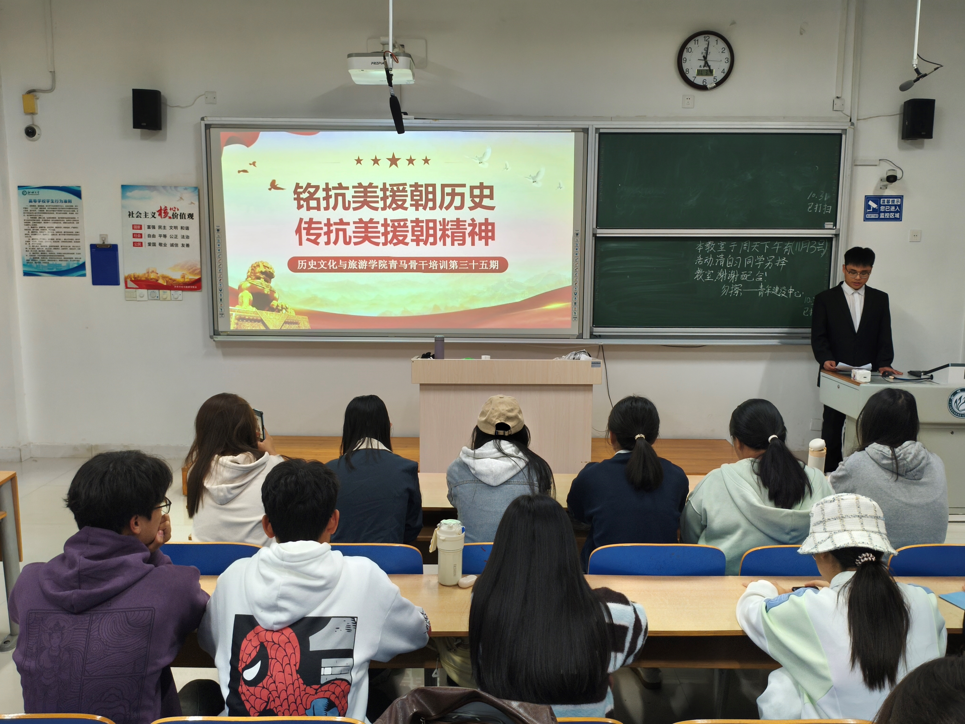 于6#A502教室举办“铭抗美援朝历史,传抗美援朝精神”第一期青马工程培训会。本次会议由徐会锴担任主讲人,2022级、2023级入党积极分子参与本次会议。 主讲人从抗美援朝的背景、过程、重大意义三部分进行详细介绍,强调抗美援朝战争对巩固新中国政权、保障新中国持续发展的深刻影响,并结合国际环境与军事形势,向同学们简要阐述抗美援朝战争的出兵原因、作战策略。主讲人举出黄继光、邱少云、孙占元三位典型志愿军代表,叙述他们在抗美援朝战争中的英勇事迹,展现出志愿军战士钢铁般的信念和无畏的勇气。主讲人指出,中国人民志愿军在极端艰苦的条件下,用生命捍卫了国家尊严,打出了中国的精气神,让世界看到了中国人民不屈的意志,为新中国赢得了宝贵的和平发展环境。 主讲人带领同学们进入击鼓传花环节,提问抗美援朝战争过程的相关问题,同学们踊跃回答,主动发表自己的见解。主讲人播放抗美援朝纪录片,纪录片以抗战老兵的回忆作为引入,重现战争情景,向同学们呈现出志愿军战士顽强的战斗意志和崇高的爱国主义精神。视频结束后,主讲人激励同学们铭记抗美援朝战争留存的宝贵精神财富和深刻启示,牢记历史,缅怀先烈,弘扬爱国主义和革命英雄主义精神。 本次会议的顺利召开,有利于为青年学生树立榜样模范,使其增强使命感、责任感,发扬爱国卫国、敢于斗争的精神,为实现中华民族伟大复兴的中国梦而努力奋斗。 (供稿:刘舒雅 摄影:刘舒雅 初审:张程程 复审:李月 终审:石晓晗)
