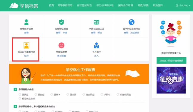 附件1:图像校对流程 1.打开学信网://www.chsi.com.cn/,点击导航栏“图像校对”,如下图: 2.在打开的页面中登录,如下图(之前已经注册过学信网的请直接登录,未注册过的需要先注册)。 3.登录后,在打开的页面中点击“毕业证书图像校对”,如下图 4.在打开的页面中,如下图,认真核对学籍基本信息,仔细查看学历照片是否为蓝底,是否为本人。 如果毕业照片为蓝底且为本人,请点击“正确”。 5.在弹出的界面中再次确认信息和照片是否为本人!并点击“确定”。 6.校对结束,底部显示学历照片正确。 附件2见://jwc.dybz6.com/jwgl/505747.html