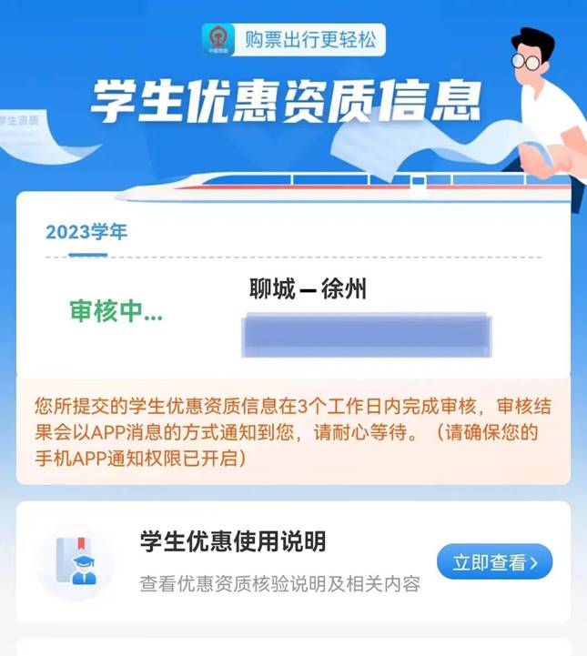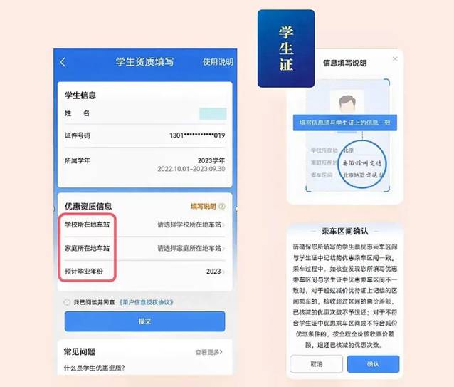 关于2024级本科新生在线核验火车票优惠资质的通知 各学院: 根据《教育部办公厅 国铁集团办公厅关于进一步便利普通高等学校学生购买优惠火车票的通知》(教学厅函〔2023〕4号)精神,现将本科新生在线核验火车票优惠资质及学生证乘车区间填写要求等有关事项通知如下: 一、学生证乘车区间填写要求 各学院组织申请火车票优惠资质的学生填写《新生火车票优惠资质乘车区间统计表》(附件1,学院留存)、填写学生证家庭所在地及乘车区间,学生乘车区间应为学校所在地至家庭所在地,或父母实际居住地,学校所在地火车站填“聊城”,家庭所在地车站需按铁道购票部门规定标准的车站名称填写(以铁道部12306网站查询的站名为准),学院审核学生填报信息无误后,在学生证乘车区间页加盖学院公章。 二、在线优惠资质核验 学生在“铁路12306”APP学生专区填写个人信息及乘车区间,用于学生优惠资质核验;《新生火车票优惠资质乘车区间统计表》、学生证、“铁路12306”APP三处填写的乘车区间必须一致。 三、“铁路12306”APP学生专区填报指南 第1步:学生登录铁路12306手机客户端,右下角“我的”页面中点击“学生优惠资质核验”专区。如果当前用户是“已注册会员”或“已经在本机完成了人脸认证”则可直接点击“填写学生资质”核验学生资质信息。 第2步:根据学生证信息如实填写学校所在地车站、家庭所在地车站(申请时准确填写个人信息和与学生证上一致的优惠乘车区间!)、预计毕业年份等信息后,点击提交。提交学生资质信息后,若信息与学信网相匹配,后台将于3天内自动审核通过。 教 务 处 2024年9月24日 教育部办公厅 国铁集团办公厅关于进一步便利普通高等学校学生购买优惠火车票的通知 //www.moe.gov.cn/srcsite/A15/s7063/202306/t20230605_1062839.html