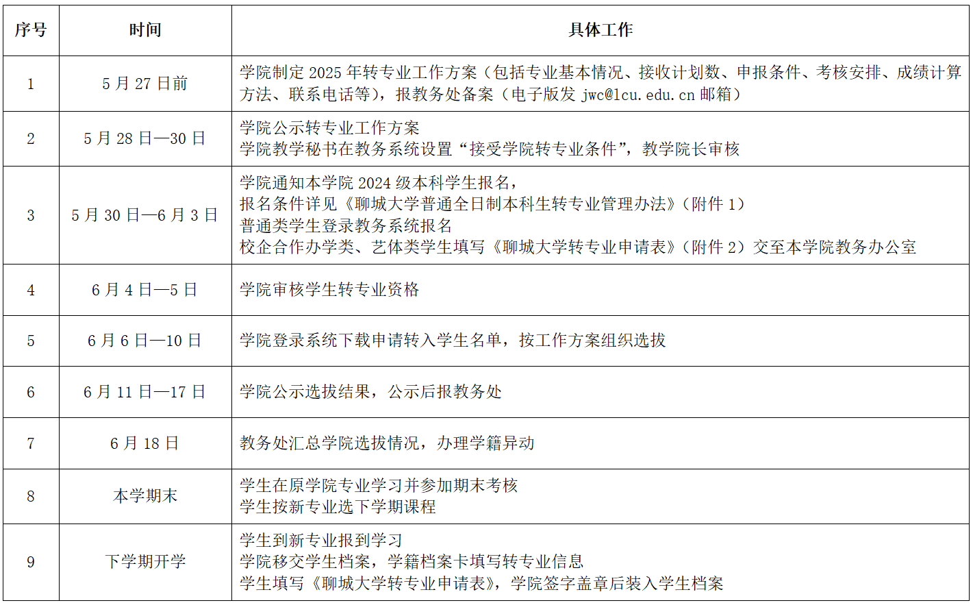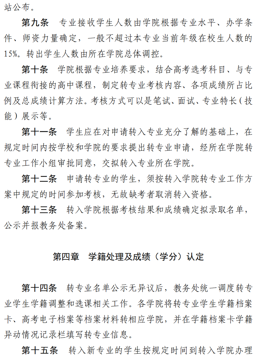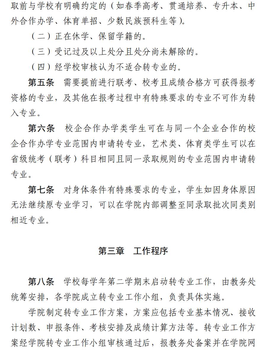 2025年普通全日制本科学生转专业工作安排 注意事项 1.转入专业对学生高考选考科目有要求的,须在转专业工作方案申报条件中明确说明。 2.申请转专业的学生须关注拟转入学院网站,及时查看学院工作方案、工作安排、结果公示等信息,严格按学院工作安排参加考核选拔,不参加考核的视为放弃资格。 3.请学院及时向学生公布相关信息,解答学生咨询,做到公平、公正、公开。 4.转专业学生补修转入专业大一开设的课程,原大一已修课程可申请课程认定,具体按照《第一版主