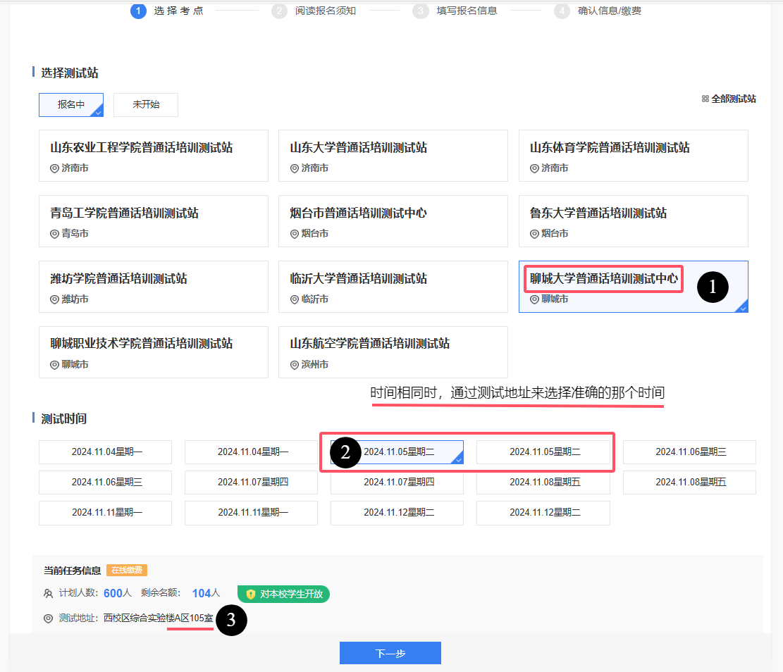 ”,“院系”请填写“本学院全称”,“从事职业”请选择:在校学生--->本科生或研究生--->师范类或非师范类(一定要选择在校学生,否则按社会人员收费)。 5. 报名时根据测试时间及测试地址选择相应的任务进行报名。 6. 根据山东省发展和改革委员会、山东省财政厅《关于明确普通话水平测试收费标准的通知》(鲁发改成本〔2022〕222号)规定,普通话水平测试收费按照在校学生每人次25元的收费标准收取。 四、测试安排 测试地点在西校综合实验楼A区1层A104(候考室为A103)、A105(候考室为A107)机房。考生需听从引导员安排,先在候考室排队进行信息采集,保存好采集员给的批次和机位号,然后听从安排有序到机房测试。考生要服从实验室管理人员和监考人员的管理,爱护设施,保持实验室整洁。测试完成后根据监考人员指令有序离场,离场后不得在走廊逗留、喧哗。 五、其他事项 1.普通话测试需测评员逐个交叉评分,省语委复审,成绩经省语委办审核后公布并办理证书(成绩公布后即可网上查询证书),证书寄到 第一版主