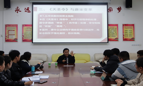 第十二期研究生读书会在政史楼A104举行。在官士刚老师的指导下,2020级和2021级中国史专业全体研究生围绕中国社会科学院历史所黄正建研究员的著作《天圣令与唐宋制度研究》进行了交流。 本次读书会共分三个环节。 第一个环节是官老师对《天圣令与唐宋制度研究》一书的概述。他首先介绍了《天圣令》的发现、内容体系及其所体现的唐宋变革因素,然后讲述了他对《天圣令》的关注,缘于其博士论文对于相关内容的向上追溯,发现漕仓、漕船和水利工程等大运河工程技术,均需从宋代甚至更早的时期寻找渊源。 第二个环节是同学们针对各自的研究兴趣分享所思所得。2021级侯林同学首先发言,他从《天圣令·丧葬令》与古典化时代的礼法关系入手,阐释了《丧葬令》及“丧服年月”在唐五代时期的演化情况,并发表了对法制史上礼法关系互动分期的看法;郇文卿同学则以《天圣令·医疾令》为关注点,对唐代医学教育体制中的女医教育进行了探讨;章俊杰同学对《天圣令》中的律、令进行了具体分析,总结了作者在本书中所运用的研究方法;孔昀同学以《天圣令·仓库令》为关注对象,对唐、宋两代仓库的管理等情况进行了梳理。2020级王雪莹同学对《天圣令》中所涉及的律和令的概念及作用进行了比较,指出唐令和宋令有相通之处;王洁惠同学同样关注到了《天圣令·丧葬令》,她以其中的部分条例为根据,阐释了古代丧葬制度与政治思想的关系;房智超同学就《天圣令·仓库令》中与宋代仓储有关的内容,与官老师进行了交流。 第三个环节是自由讨论,同学们针对书中的一些观点、概念展开讨论,互相阐述了自己在阅读过程中遇到的问题与困惑。针对同学们提出的问题,官老师进行了耐心细致地解答。最后,官老师对本次读书会进行了总结。他指出,第一,对于历史研究尤其是中国古代史研究而言,考古学的工具性作用越来越明显,它能够提供另外的、更多元的视角,因此,除了要利用传世文献之外,还要多多关注考古学的相关成果,关注出土文献;第二,对于研究生而言,要具有问题意识,尤其是注重训练自己从文献中发现问题的能力,以达到学术上的提升。 通过本次读书会,同学们增强了阅读及思考能力,进一步拓宽了学术视野。官老师反复强调的多视角解读文献的理念,也为同学们今后的学术研究提供了方法论指导。