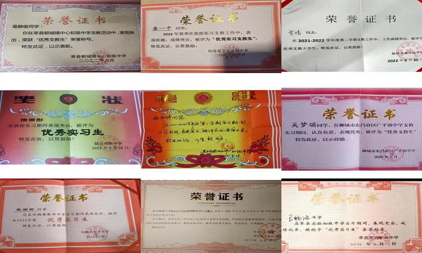 的实习纪律、实习学校的工作纪律和各地疫情防控的政策,克服疫情和其他各种困难,用自己的努力和实际行动,出色地完成了支教工作任务,获得了实习单位的一致好评:38名同学获得“优秀支教教师”荣誉称号,50名同学获得“优秀支教大学生”荣誉称号,4名同学获得“优秀实习班主任”荣誉称号,1名同学所教课程被评为“校级优质课”,1名同学在实习学校的青年教师现场说课备课大赛中获得二等奖,1名同学被评为校级“教学能手”,3名同学在实习学校的学科竞赛中获得“优秀指导教师”荣誉称号,6名同学的教案被评为“优秀教案”,10名同学所教课程因阶段性考试和期中考试成绩优异被评为“优秀教师”。除了教学工作外,第一版主