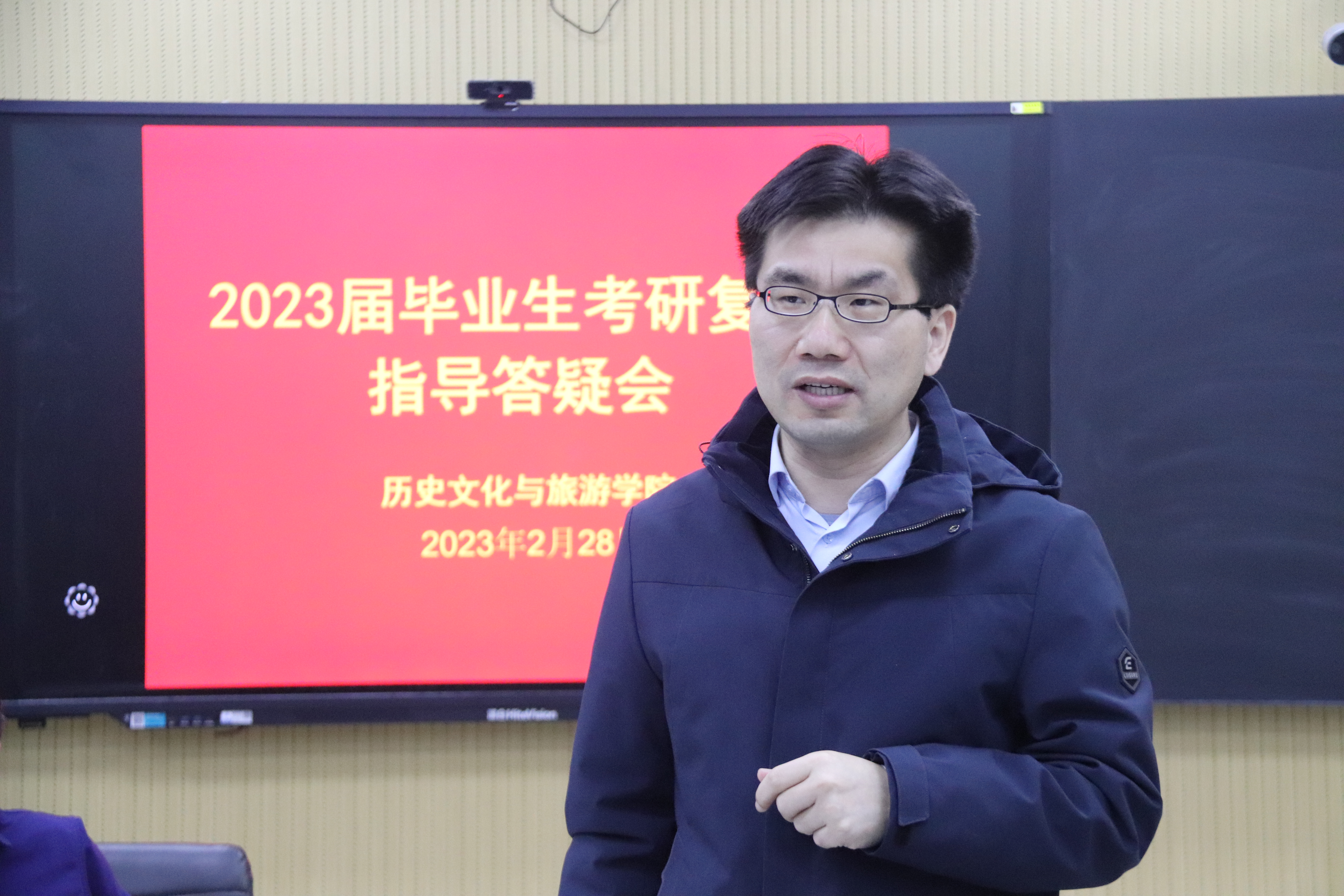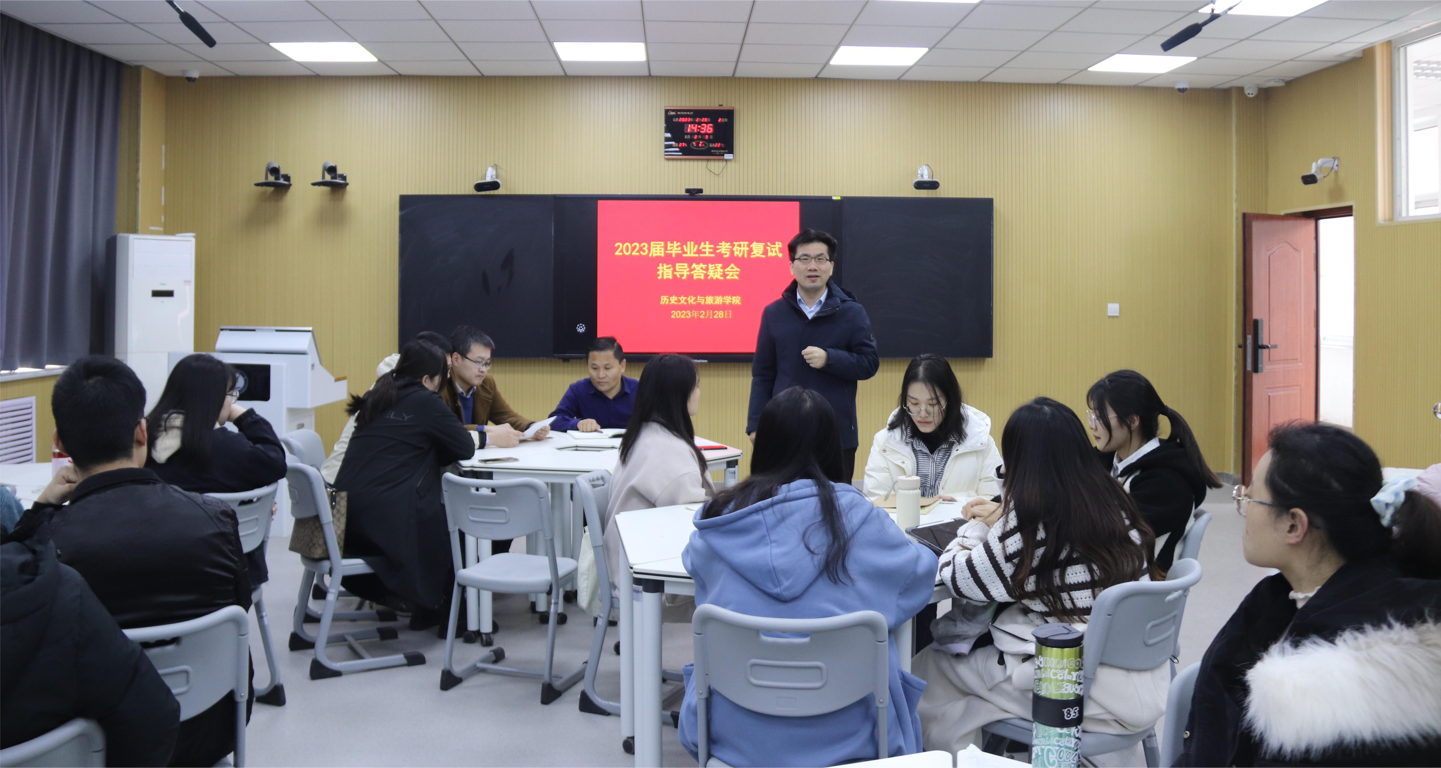 三个专业学生初试的基本情况,介绍了举办本次讲座的目的。他指出,近年来各高校硕士研究生招录的难度日益提高,因此,同学们要做好三件事情:一是反思自身考研成绩,密切关注报考院校的资讯公告,做好复试信息的搜寻,认准定位聚焦范围;二是巩固专业知识,要稳扎稳打,做好专业知识的复习回顾;三是踏实勤奋备战复试,笔试成绩的公布并不意味着备考结束,同学们还需全力准备复试,确保报考院校成功录取。 随后,旅游管理专业教师代表刘建峰老师从三个方面为同学们答疑解惑。第一,应做好复试心态的调整,他建议同学们在适当紧张的同时,也要保持自信大方,做到松中有紧;第二,要加强沟通联系,同学们应扩宽社交圈,积极与老师沟通明确院校选择及复试准备,充分汲取上岸同学的考研经验;第三,他提醒同学们应注意个人形象,提前准备面试着装,仪容得体大方,给导师以良好的形象。 中国古代史专业教师代表解祥伟老师以自身的考研经历为例,鼓励同学们多读史料、精读专著,并要有自己的看法和观点。他提醒同学们要提前阅读报考院校相关学者的论文,明确所报院校专业老师的研究专长,为从容应对复试考试做好充足准备。他还强调同学们应完善毕业论文的撰写工作,建立完善的内容框架,能够沉稳应答复试院校老师们关于毕业论文的相关问题。 中国近代史专业教师代表郭伯虎老师建议同学们时刻关注专业领域的研究前沿,熟悉著名学者的研究成果,并嘱咐同学们在复试过程中应体现谦卑好学的态度,回答问题逻辑清晰,切记不要盲目自信。 世界史专业教师代表张思老师则从世界史专业出发,要求同学们着重进行英文口语问答模拟练习,并提醒同学们提前准备英文自我介绍,在介绍语中,应具有自身的特色,能够让复试院校的老师眼前一亮。 在会后的提问环节,各位老师认真解答了同学们提出的问题,这有利于他们调整心态,增强信心。预祝愿第一版主