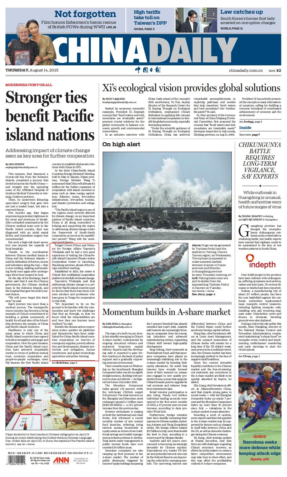 8月14日,《中国日报》(China Daily)头版报道中国与太平洋岛国紧密合作关系,并介绍了双方在应对气候变化重点领域开展的合作。文中提到,汤加外交大臣兼国防大臣图普托阿·乌卢卡拉拉王储到访中国-太平洋岛国应对气候变化合作中心。乌卢卡拉拉王储对中心开展的工作给予高度评价,并表示应对气候变化是太平洋岛国的优先事务,已有中国学者前往汤加开展相关合作。 太平洋岛国研究中心主任赵少峰教授接受《中国日报》专访,谈第三次中国—太平洋岛国外长会后中国与太平洋岛国合作新局面。赵少峰谈到,近年来多次访问太平洋岛国,当地人民的真诚给他留下了深刻的印象。他表示,太平洋岛国政府普遍缺乏开发资源的能力,希望能够搭上中国发展的快车。中国为落实第三次中国—太平洋岛国外长会共识所准备的系列举措,涵盖了自由贸易协定谈判、智库论坛、奖学金等太平洋岛国迫切需要的12个领域。在元首外交引领下,中国与太平洋岛国务实合作不断向前发展。