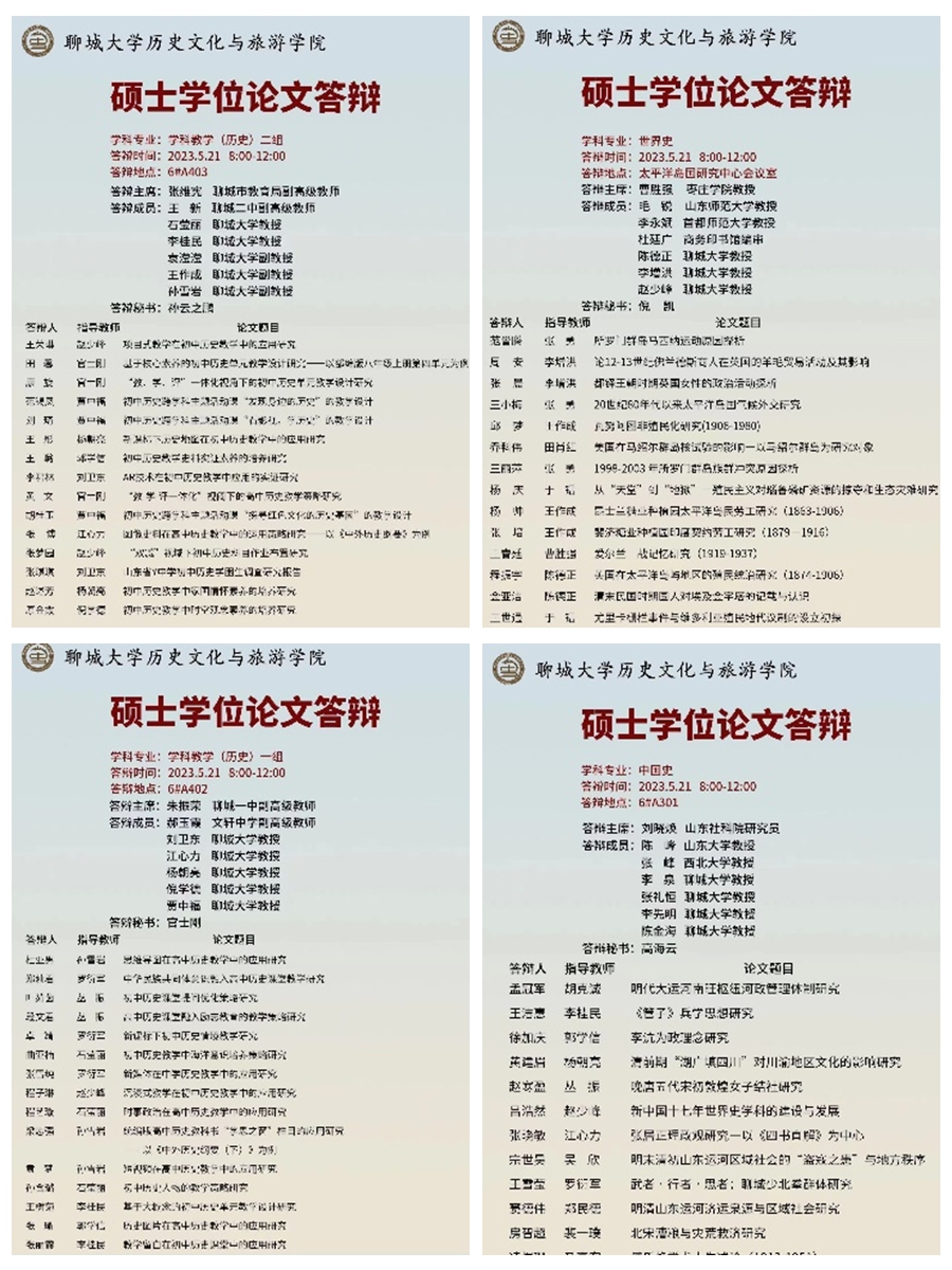 于政史楼举办2023届研究生学位论文答辩会,本届论文答辩会共四个答辩组。答辩会邀请到山东大学、西北大学、首都师范大学、山东社科院等知名高校及研究机构专家学者莅临指导,部分21级和22级的硕士研究生到会旁听。 四组同学按照顺序依次进行了现场答辩,各位研究生就硕士论文的选题意义、框架、主要内容和结论等作简要陈述。答辩委员对论文进行评述并提问,各位研究生结合论文内容,作了认真细致的回答。经答辩委员会认真讨论并投票表决,最后由答辩委员会主席宣布答辩结果。 第一版主