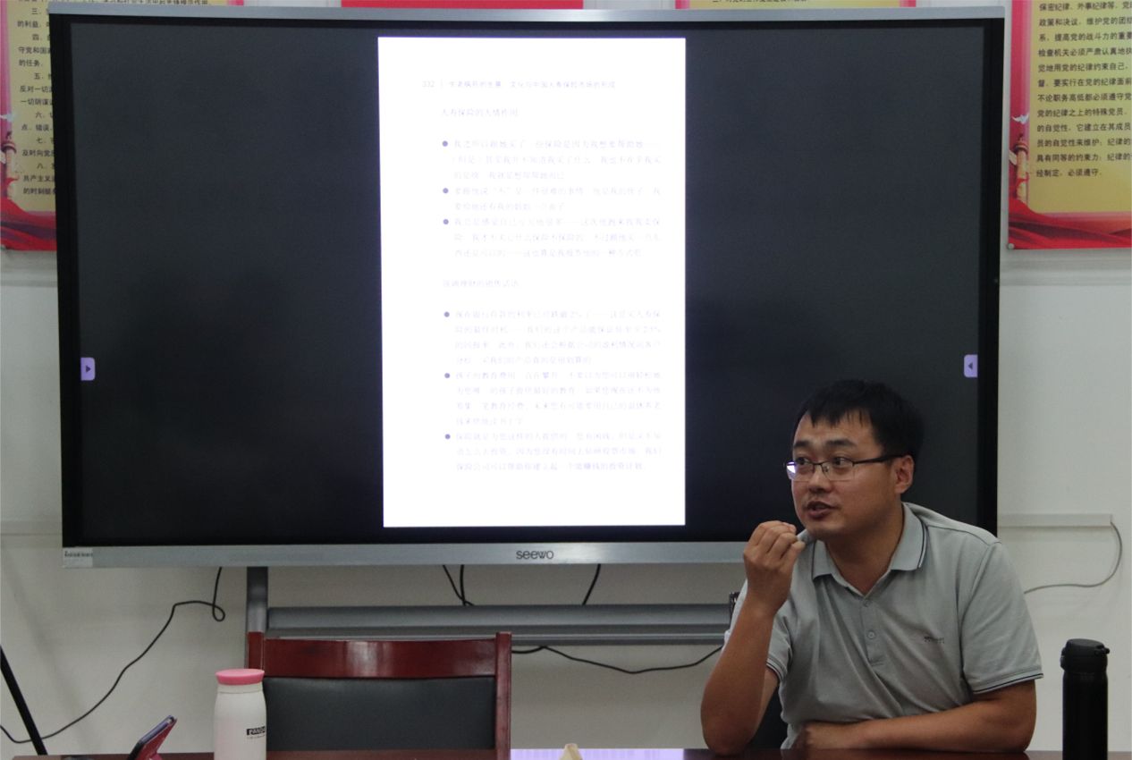 于6#A104教室举办第二十九期研究生读书会。本期读书会阅读书目为陈纯菁教授的《生老病死的生意:文化与中国人寿保险市场的形成》,第一版主