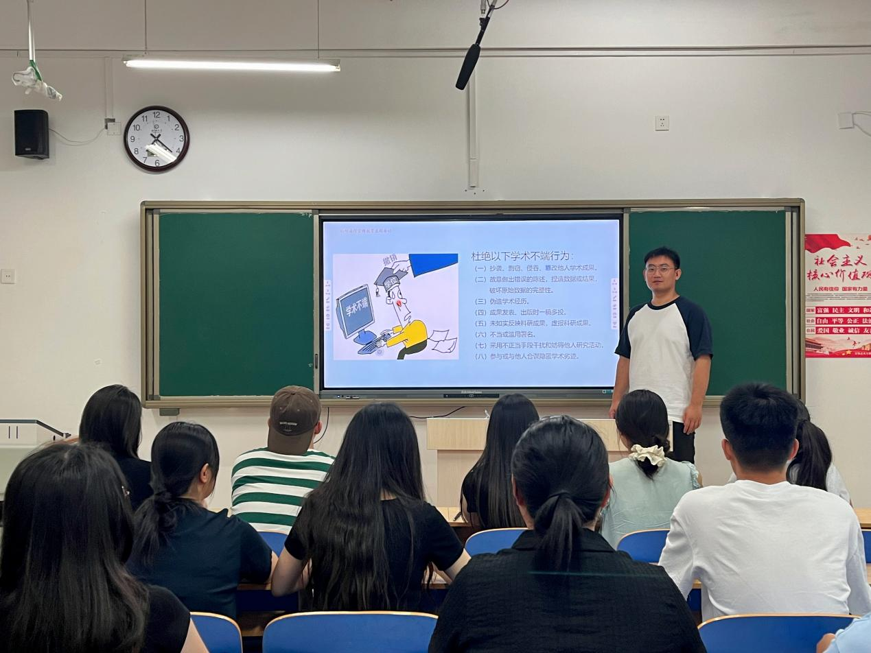 于6#C402开展科研诚信宣传教育主题活动。此次活动由研究生会学术部部长李东青主持,全体研究生参加。 会上,李东青详细介绍了《教育部关于加强高等学校科研诚信建设和学术不端治理的指导意见》及《高等学校学术不端行为调查处理实施细则》等文件精神,深刻阐述了科研诚信是科研活动的基本准则。他提醒同学们,毕业论文是研究生科研成果的重要体现,在论文写作过程中,要坚决抵制抄袭他人学术成果、伪造学术经历等行为,自觉遵守学术规范,守住学术道德底线。 本次活动的开展,有利于强化第一版主