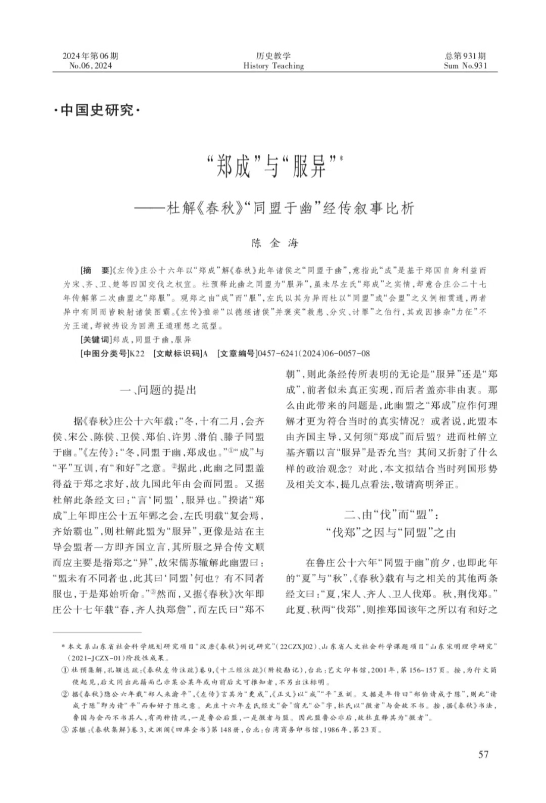 学术简报丨陈金海:“郑成”与“服异” ——杜解《春秋》“同盟于幽”经传叙事比析