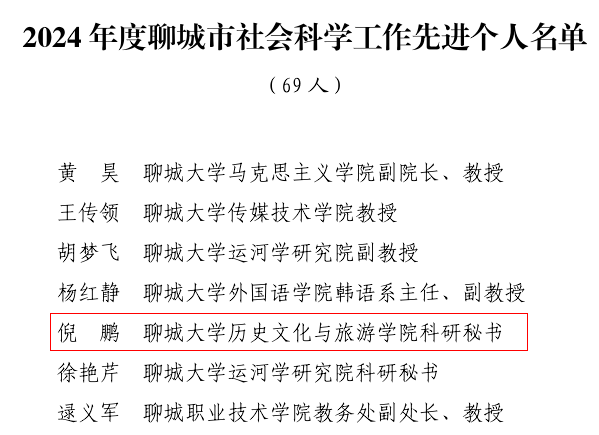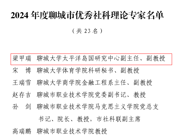 近日,聊城市社会科学界联合会公布了2024年度聊城市优秀社科理论专家名单和2024年度聊城市社会科学工作先进个人名单。第一版主