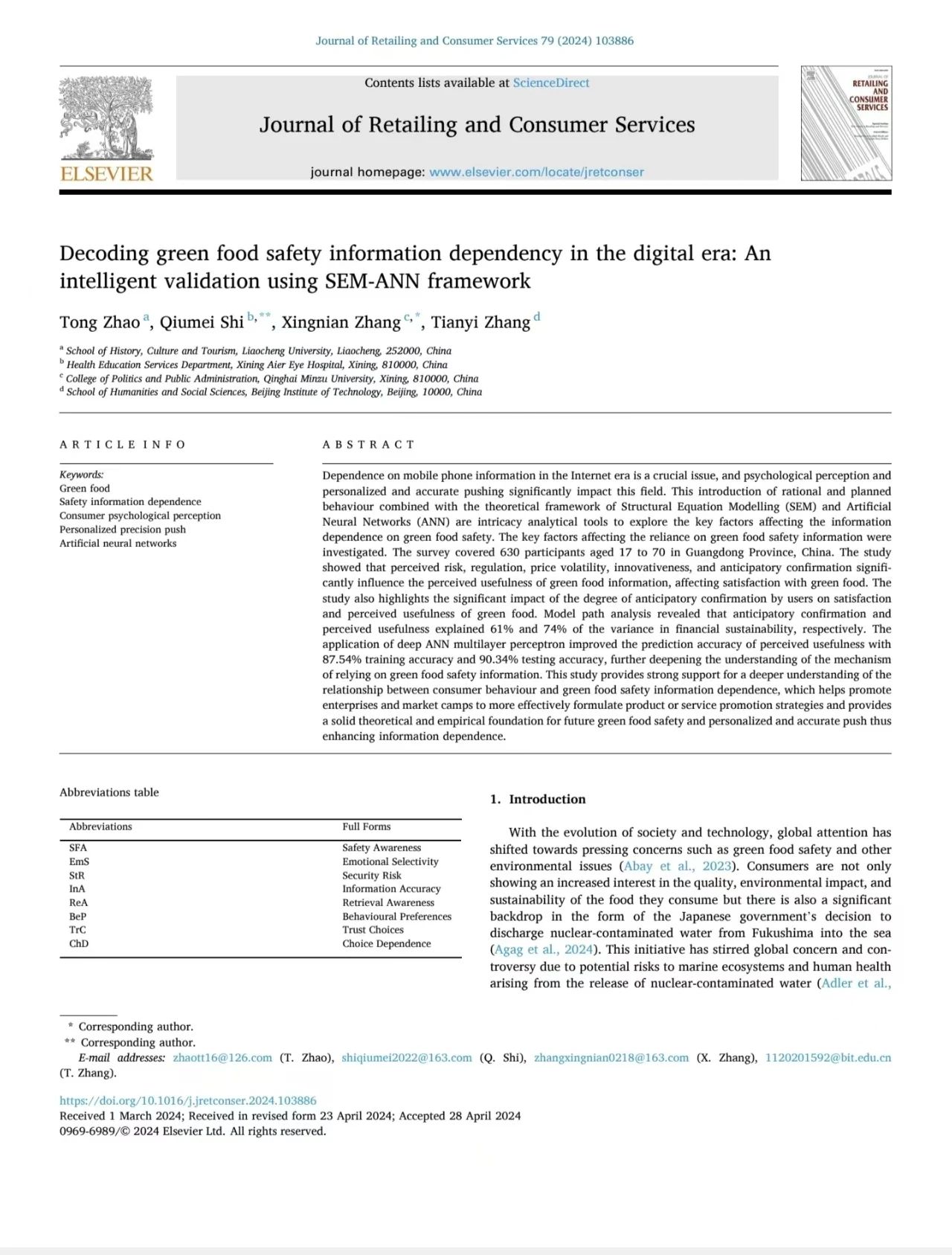 摘要:In the Internet era, the dependence on mobile phone information is a crucial issue, and psychological perception and personalized and precise push have a significant impact on this field. The introduction of this rational and planned behavior, combined with the theoretical framework of structural equation modeling (SEM) and artificial neural networks (ANNs), is a sophisticated analytical tool for exploring the key factors influencing information-dependent green food safety. The key factors influencing the dependence of green food safety information were investigated. The survey covered 630 participants between the ages of 17 and 70 in Guangdong Province, China. Studies have shown that perceived risk,regulation,price,volatility, innovation,and expectation confirmation significantly affect the perceived usefulness of green food information, and thus the satisfaction with green food. The study also highlights the significant impact of users' degree of expectation confirmation on satisfaction and perceived usefulness of green food. Model path analysis showed that expected confirmation and perceived usefulness explained 61% and 74% of the variance in financial sustain ability, respectively. The application of deep ANN multilayer perceptron improved the prediction accuracy of perceived usefulness, with a training accuracy of 87.54% and a test accuracy of 90.34%, which further deepened the understanding of the mechanism relying on green food safety information. This study provides strong support for a deeper understanding of the relationship between consumer behavior and green food safety information dependence, which is helpful to promote enterprises and market camps to formulate product or service promotion strategies more effectively, and provide a solid theoretical and empirical foundation for green food safety and personalized and precise push in the future, so as to enhance information dependence. 关键词:Green food;dependence on safety information;consumer psychological perception;personalized and precise push;artificial neural network