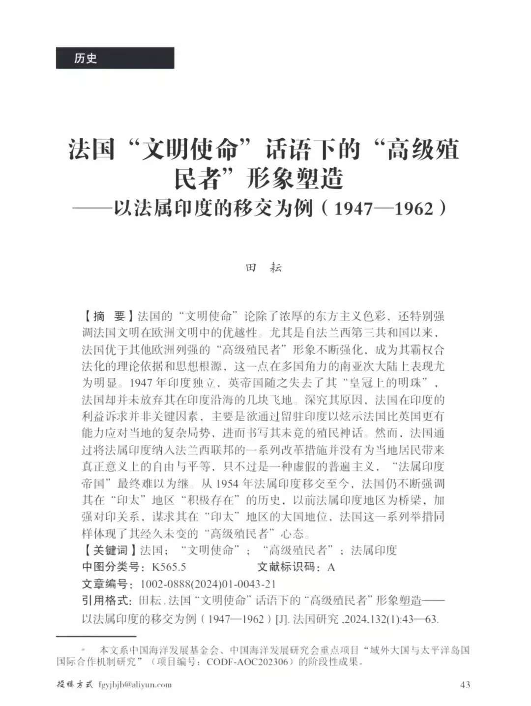 学术简报丨《法国“文明使命”话语下的“高级殖民者”形象塑造--以法属印度的移交为例(1947-1962)》