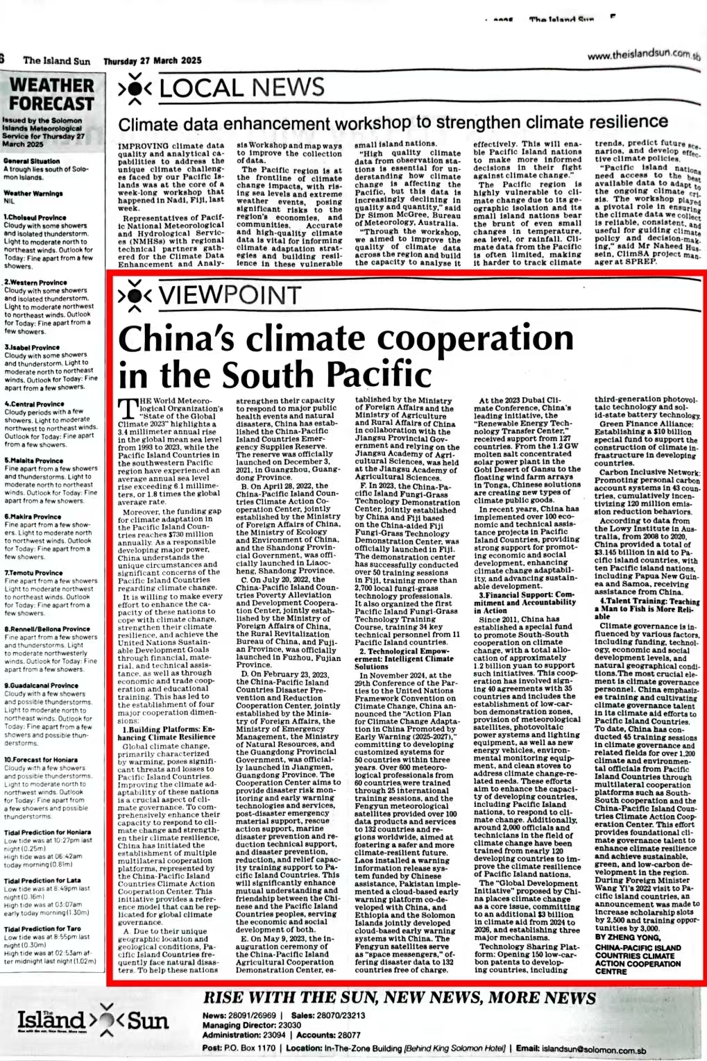 3月27日,所罗门主流媒体《岛屿太阳报》刊登了中国-太平洋岛国应对气候变化合作中心常务副主任陈德正教授和人才培训部部长陈永金博士撰写的文章《中国与太平洋岛国的气候合作》(署名正永)。 文章从发达国家的历史欠账与气候治理困局、中国的绿色转型实践、中太气候合作的创新范式以及全球气候治理新秩序重塑四个方面,探讨了全球气候治理的责任重构与发展中国家的绿色突围路径,分析论证了中国在全球气候治理中的实践与贡献。文章强调,中国已经成为全球气候治理的领导者、绿色低碳发展的引领者,更是广大发展中国家气候治理可以信赖的伙伴。 《岛屿太阳报》(The Island Sun)是所罗门群岛的权威媒体之一,在当地具有较高的公信力和舆论影响力,是当地政府、企业和民众获取信息的重要来源。