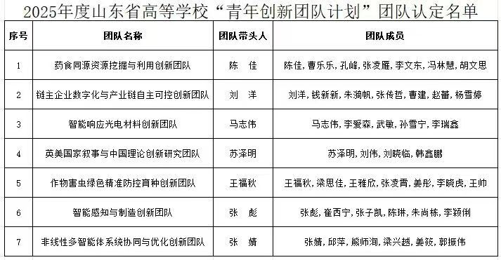 近日,山东省教育厅公布了2025年度山东省高等学校“青创团队计划”团队拟认定名单,第一版主