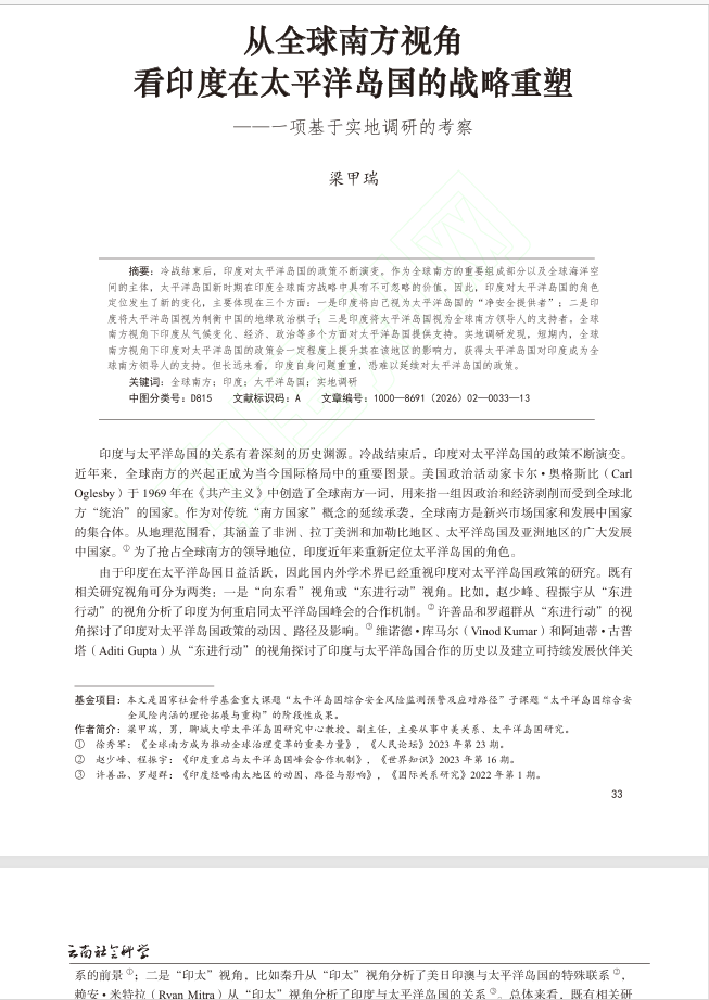 近日,梁甲瑞教授在《云南社会科学》2026年第2期发表题为《从全球南方视角看印度在太平洋岛国的战略重塑——一项基于实地调研的考察》的学术论文。文章依托作者近年来在斐济、萨摩亚、瑙鲁、基里巴斯、帕劳等太平洋岛国开展的实地调研,以全球南方为理论视角,系统剖析印度在太平洋岛国的角色定位与战略意图,梳理其相关政策实践与推进路径,为中国在太平洋岛屿地区妥善处理与印度的关系、开展务实合作提供学理参考与对策建议。