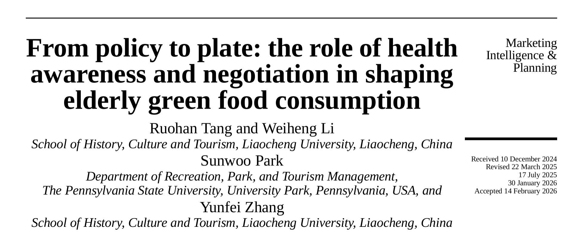教师唐若菡博士、张云飞博士、美国宾夕法尼亚州立大学Sunwoo Park博士,以及旅游管理专业本科生李炜恒共同完成,是科研与人才培养深度融合方面取得的又一重要成果。 Marketing Intelligence & Planning由Emerald Publishing出版,是国际营销与商业管理领域具有重要影响力的SSCI收录期刊,最新影响因子为5.4,位于JCR Q1分区。该刊长期聚焦消费者行为、市场战略、营销智能、数字化转型与可持续消费等前沿议题,致力于推动营销理论创新与管理实践的融合发展,研究成果在国际学术界享有良好声誉。 本研究将国际宏观绿色食品政策导向与微观消费行为相联结,基于拓展的刺激—机体—干预—响应(SOIR)框架,考察全球慢性病老年患者的绿色食品消费行为,检验健康意识的中介作用与协商能力的调节作用。研究采用混合研究方法,对绿色食品政策文件进行语义网络分析,并通过结构方程模型分析中国慢性病老年患者的调研数据。结果表明,绿色食品政策所归纳的主题聚类在塑造供给优先级、引导老年食品选择中发挥着指引作用;健康意识在利益感知与购买意向之间发挥中介作用,将感知利益转化为实际购买行为;协商能力则负向调节约束感知与习惯性购买意向之间的关系,能够缓解经济与可及性压力。研究成果为政策制定者与市场主体提供实践指导,有助于推动可持续食品消费,深化对老年健康导向型绿色食品消费的理解。 该研究体现了第一版主
