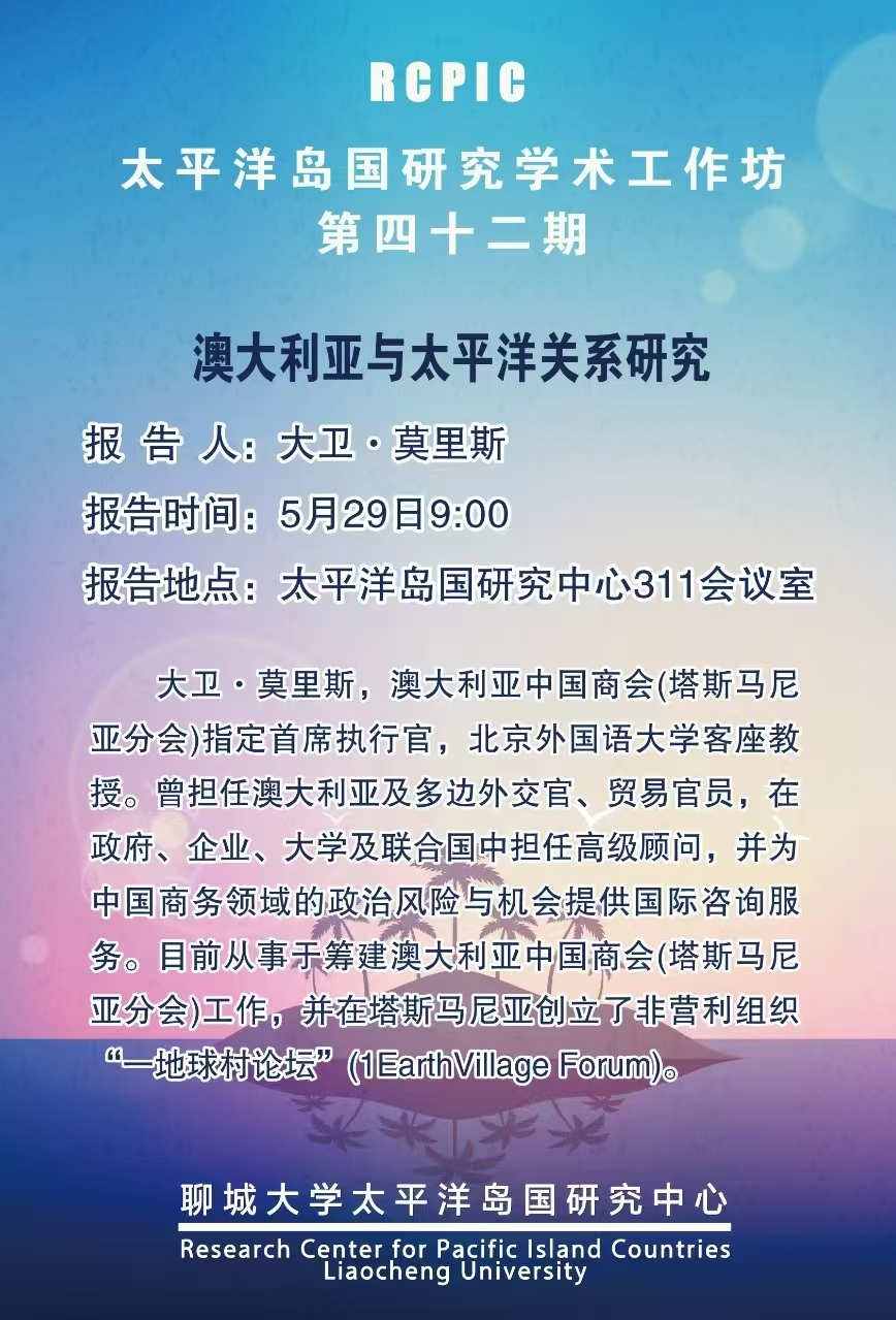主题:澳大利亚与太平洋关系研究 主讲人:大卫·莫里斯 时间:2025年5月29日9:00 地点:太平洋岛国研究中心311会议室 主讲人简介 大卫·莫里斯,澳大利亚中国商会(塔斯马尼亚分会)指定首席执行官,北京外国语大学客座教授。曾担任澳大利亚及多边外交官、贸易官员,在政府、企业、大学及联合国中担任高级顾问,并为中国商务领域的政治风险与机会提供国际咨询服务。目前从事于筹建澳大利亚中国商会(塔斯马尼亚分会)工作,并在塔斯马尼亚创立了非营利组织“一地球村论坛”(1EarthVillage Forum)。