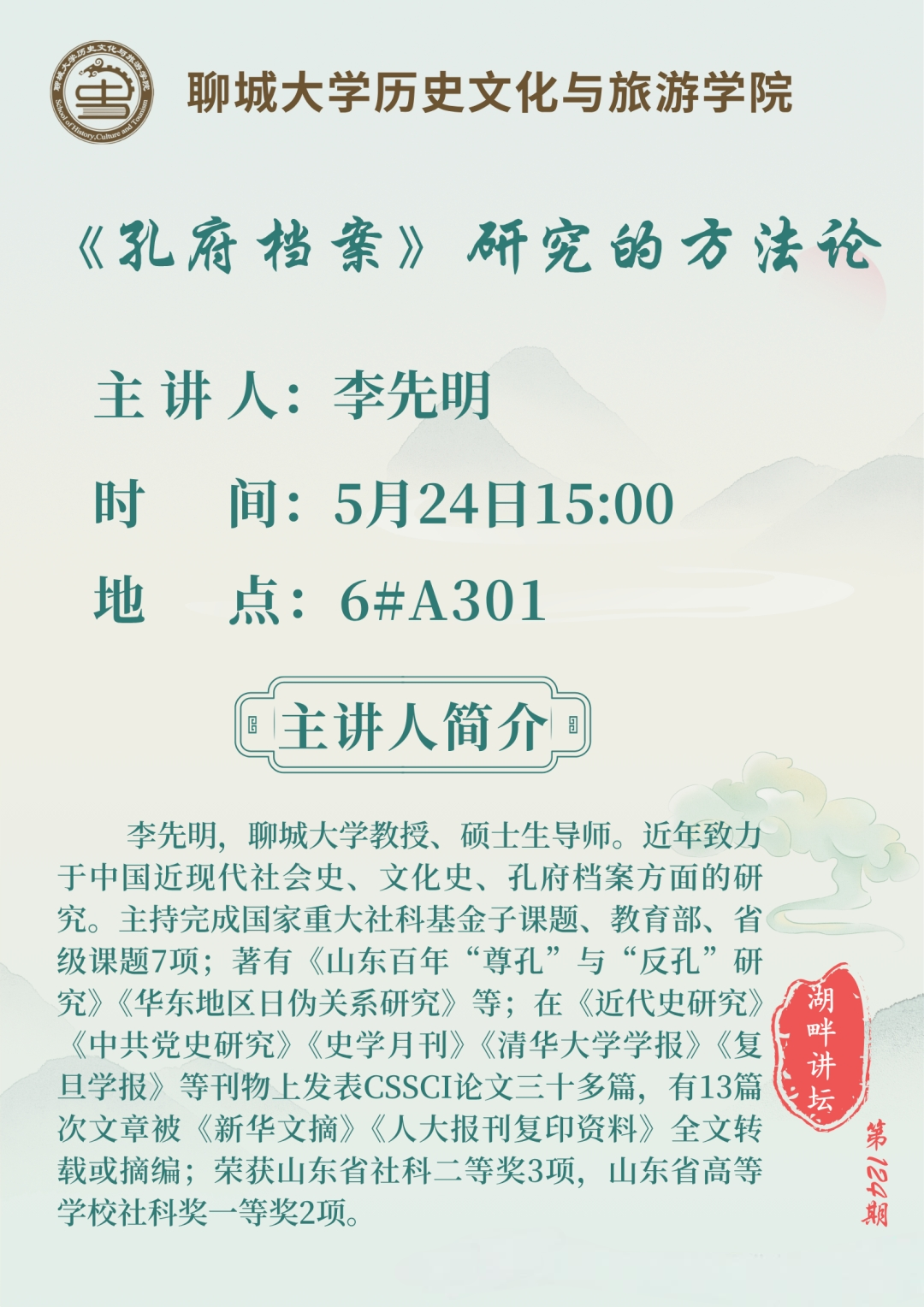 主题:《孔府档案》研究的方法论 主讲人:李先明 时间:2025年5月24日15:00-17:00 地点:6#A301 主讲人简介 李先明,第一版主