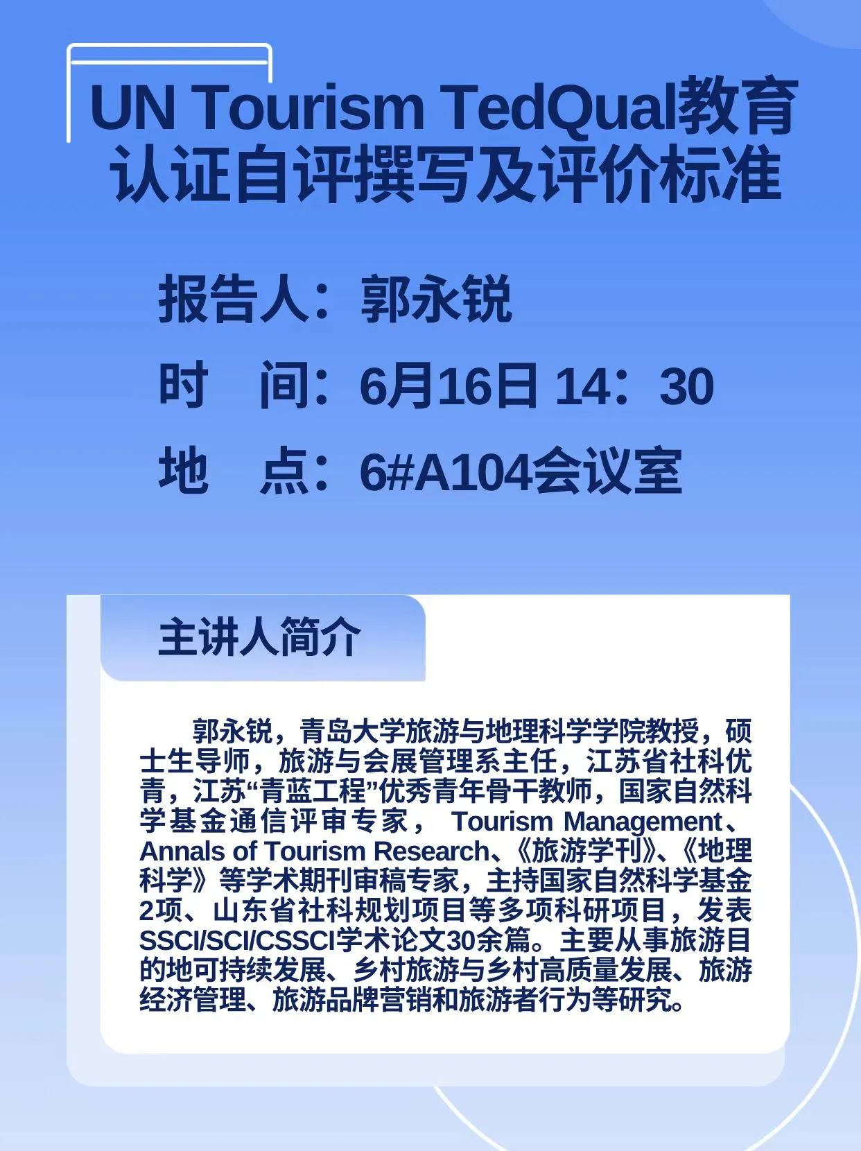 主题:UN Tourism TedQual教育认证自评撰写及评价标准 主讲人:郭永锐 时间:2025年6月16日 14:30—16:30 地点:6#A104会议室 主讲人简介:郭永锐,青岛大学旅游与地理科学学院教授,硕士生导师,旅游与会展管理系主任,江苏省社科优青,江苏“青蓝工程”优秀青年骨干教师,国家自然科学基金通信评审专家,Tourism Management、Annals of Tourism Research、《旅游学刊》、《地理科学》等学术期刊审稿专家,主持国家自然科学基金2项、山东省社科规划项目等多项科研项目,发表SSCI/SCI/CSSCI学术论文30余篇。主要从事旅游目的地可持续发展、乡村旅游与乡村高质量发展、旅游经济管理、旅游品牌营销和旅游者行为等研究。