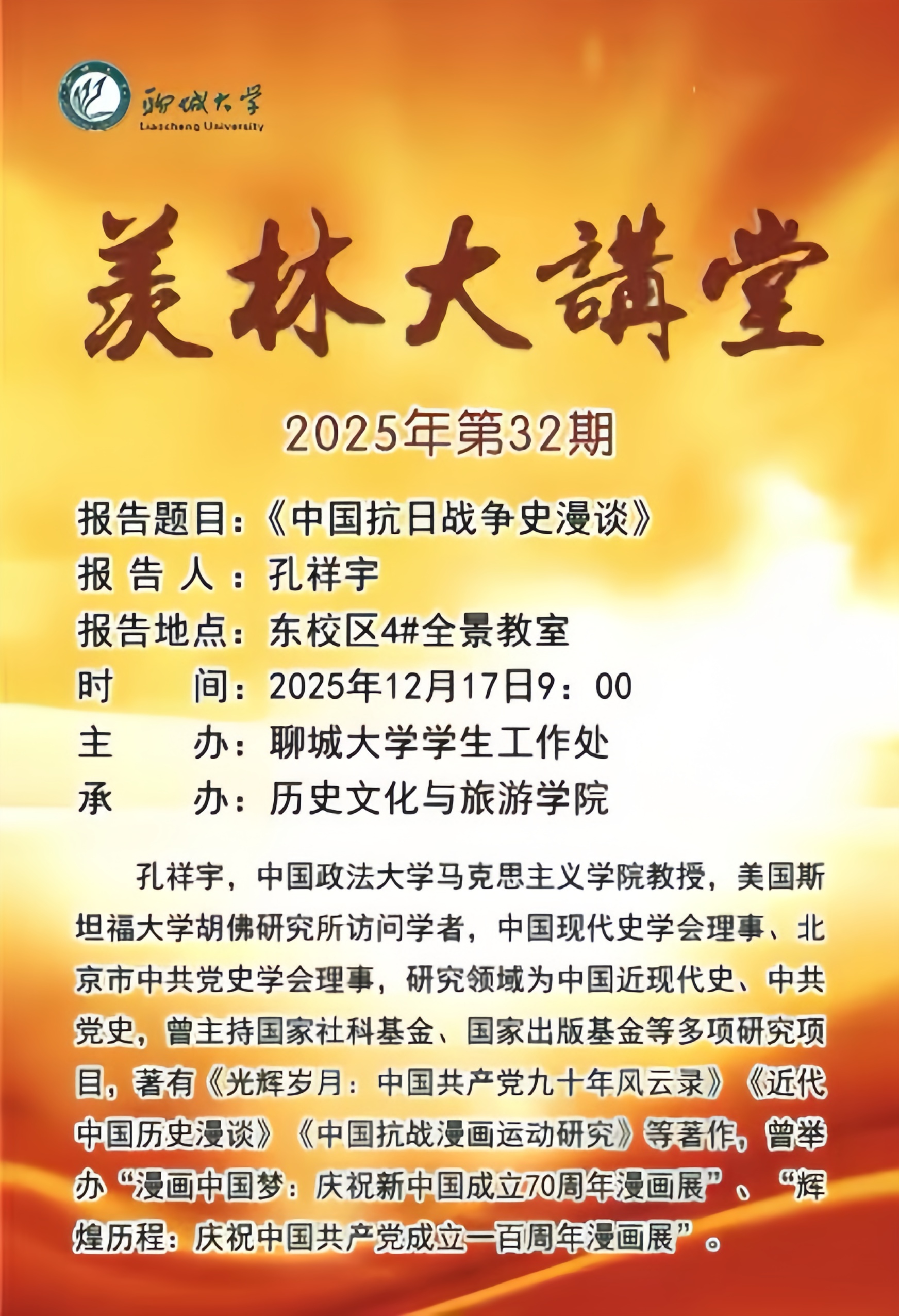 主题:中国抗日战争史 主讲人:孔祥宇 时间:2025年12月17日 地点:东校区4#全景教室 内容简介 本次报告以习近平总书记关于中国抗战史的系列讲话为指导,先系统阐述正确的抗战史观,深刻把握抗日战争的历史本质、伟大意义与时代价值,再以抗战漫画为媒介,分“抗战中的漫画”与 “漫画中的抗战”两部分解读漫画所承载的抗战史实、民族精神与民众心声,全方位呈现漫画与抗战历史的深度交融,以此缅怀历史,纪念中国人民抗日战争暨世界反法西斯战争胜利80周年,欢迎广大师生交流探讨。