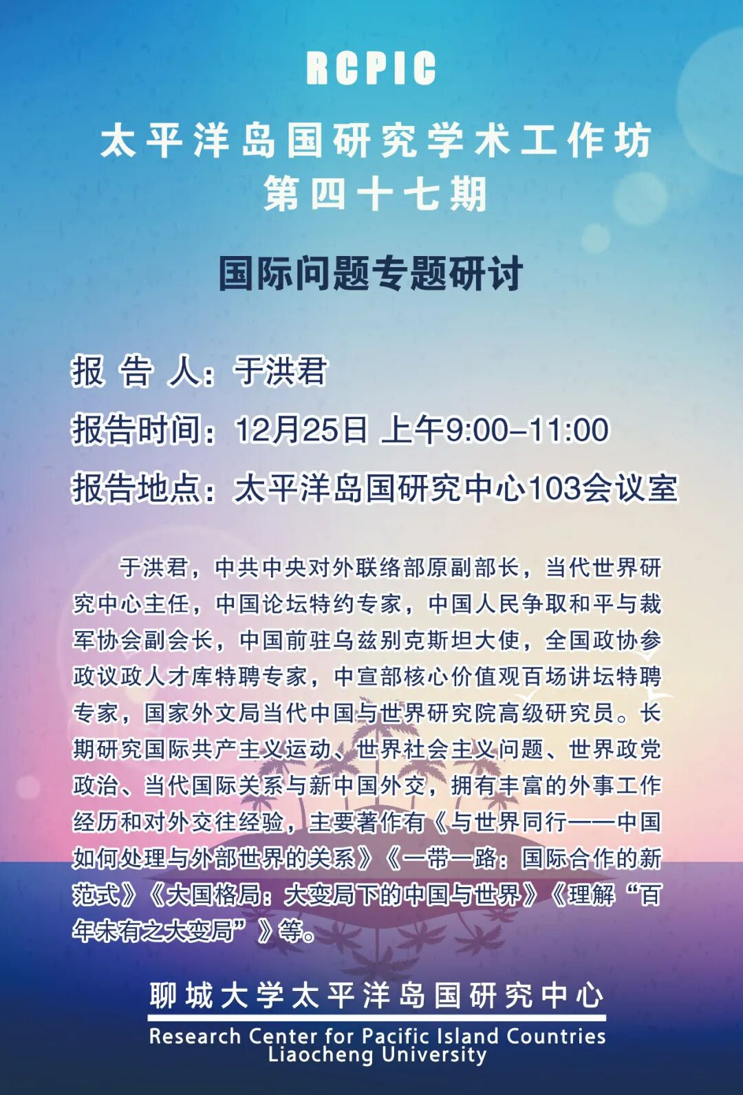 主题 国际问题专题研讨 主讲人 于洪君 时间 12月25日 上午9:00-11:00 地点 太平洋岛国研究中心103会议室 主讲人简介 于洪君,中共中央对外联络部原副部长,当代世界研究中心主任,中国论坛特约专家,中国人民争取和平与裁军协会副会长,中国前驻乌兹别克斯坦大使,全国政协参政议政人才库特聘专家,中宣部核心价值观百场讲坛特聘专家,国家外文局当代中国与世界研究院高级研究员。长期研究国际共产主义运动、世界社会主义问题、世界政党政治、当代国际关系与新中国外交,拥有丰富的外事工作经历和对外交往经验,主要著作有《与世界同行——中国如何处理与外部世界的关系》《一带一路:国际合作的新范式》《大国格局:大变局下的中国与世界》《理解“百年未有之大变局”》等。