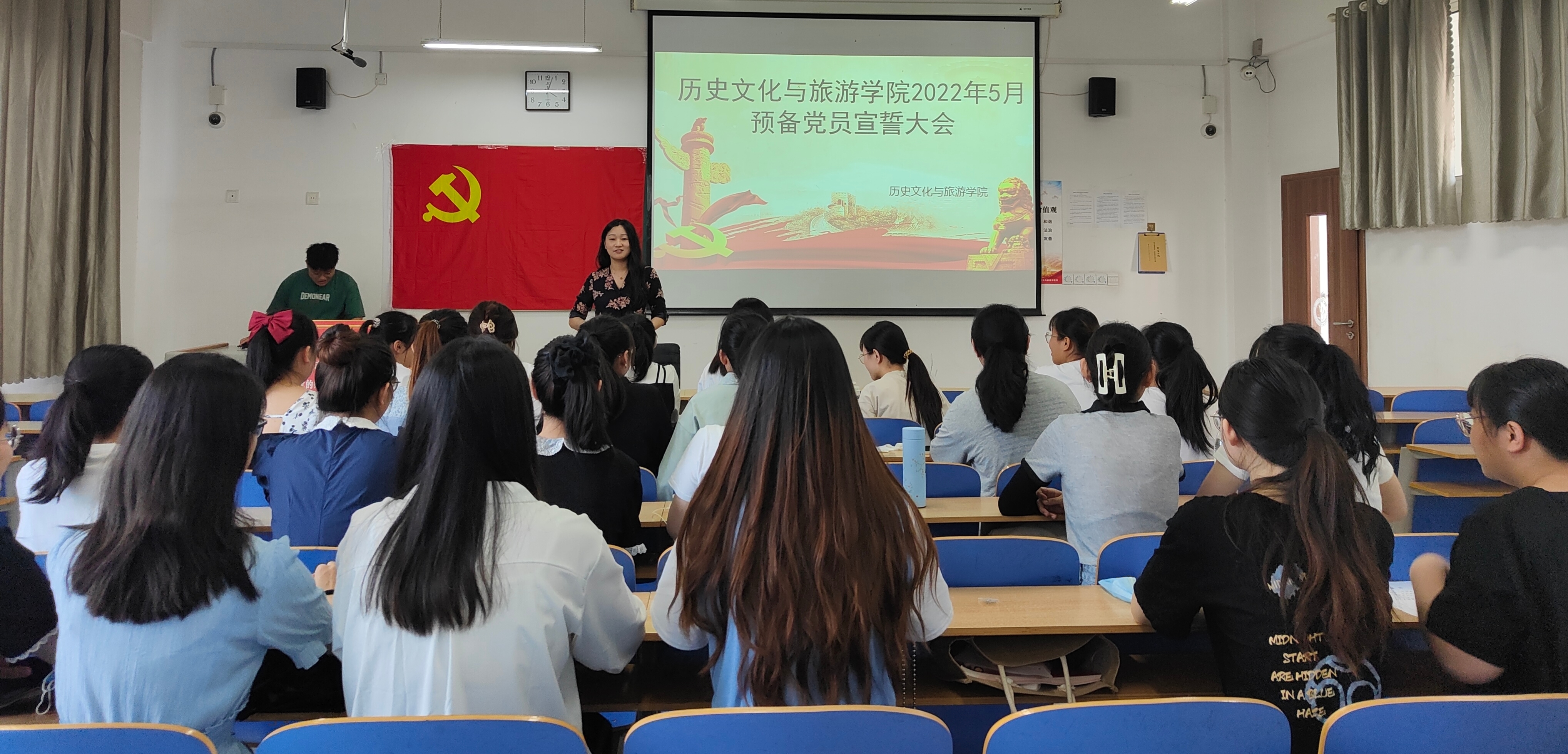 本科生党支部于6#A405教室举行入党宣誓仪式。本次宣誓由薛天同志主持,26名新发展的预备党员参加。 大会在《国际歌》庄严肃穆的旋律中拉开序幕。大会伊始,薛天同志为本次宣誓大会发表致辞。她强调,预备党员面向党旗进行入党宣誓,是发展党员工作的必经程序,入党誓词是新党员在入党时对党和人民作出的庄严承诺,同时也是党员必须遵守的行为准则。薛天同志要求在场同志要时刻牢记党的基本要求,增强党性观念,不断提高自身政治责任感。 随后,薛天同志带领预备党员进行庄严宣誓。预备党员在领誓人的带领下,紧握右拳,面向鲜红的党旗郑重宣誓,铿锵有力的宣誓声展现了在场预备党员为共产主义奋斗终生的决心和信念。大会最后,薛天同志作总结发言,她为预备党员送上美好祝福的同时,也对其提出了新的要求。她强调,在场同志应时刻以党员的标准严格要求自己,用实际行动履行党旗下的誓言,积极投身社会主义现代化事业,同时也要加强理论学习,锤炼党性修养,在日后的学习生活中自觉担负起责任和使命,充分发挥党员的先锋模范作用。 此次宣誓大会的召开,切实推进了第一版主