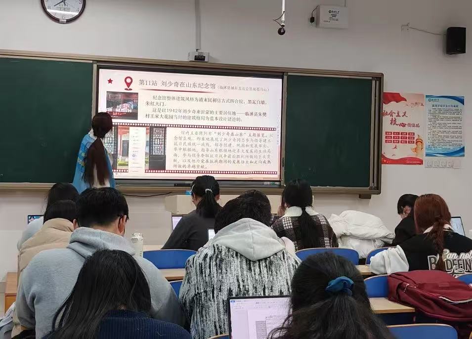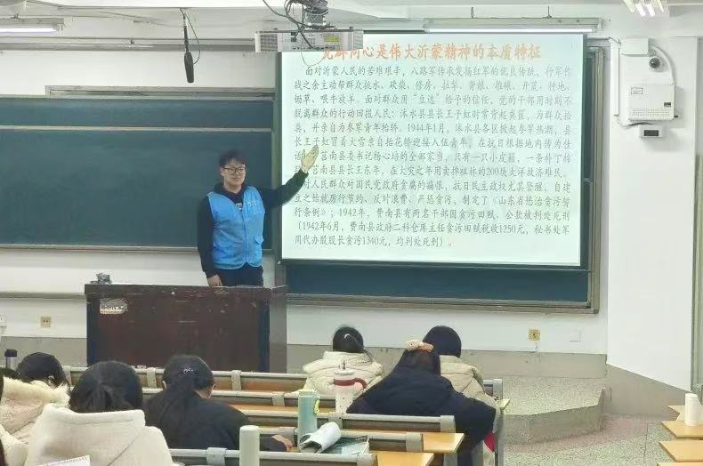 “史学不辍 沂蒙情长”志愿宣讲团之“高唱沂蒙颂歌,共赞巾帼风采”主题宣讲活动。 “蒙山高,沂水长,军民心向共产党。”一首《沂蒙颂》带着同学们的思绪穿越时空,来到革命年代的沂蒙山区。宣讲团成员以“水乳交融,生死与共”的沂蒙精神开篇,讲述“沂蒙红嫂”的英雄事迹。其中,聋哑母亲明德英用乳汁喂养在反“扫荡”突围中身负重伤、失血过多、脱水休克的八路军小战士,生动展现了“水乳交融”的真切含义,同学们也为沂蒙红嫂不畏牺牲、不畏强敌、不惧风险、甘于奉献的巾帼风采所深深打动。 “红布裹,青石藏,沂水养大的娃儿哟,踩着枣花儿回家乡……”宣讲员们通过视频再现“沂蒙山回荡着沂蒙母亲轻柔的歌声,一个个八路军后代和烈士遗孤在沂蒙母亲的怀抱里,在《拾婴谣》的歌声中进入梦乡,做着甜甜的梦……”的场景。在宣讲团成员深情地讲述中,同学们对沂蒙山区一位位巾帼英雄充满钦佩。同时,宣讲员以照片的形式带同学们云游王换于纪念馆,让同学们更深切地感受到沂蒙母亲的无私伟大。 “山河破碎飘摇处,沂蒙军民共甘苦。”这首《沂蒙精神耀中华》不仅歌颂蒙山和沂河的壮丽景色,还在字里行间赞颂沂蒙军民在抗日战争和解放战争中的英勇斗争。宣讲员强调,沂蒙山区的巾帼英雄不只是明德英、王换于等几位为人们所熟知的典型代表,沂蒙山的革命女性是群像,是一群热血而坚定的战士。同时,宣讲员分享了“沂蒙六姐妹”“女子火线桥”的革命故事,展现出巾帼风采。 “人人那个都说哎,沂蒙山好,沂蒙那个山上哎,好风光。”宣讲尾声,宣讲员们带领学生齐唱《沂蒙山小调》,这首民歌蜚声海内外,已成为沂蒙山区革命年代的符号。 这次“高唱沂蒙颂歌,共赞巾帼风采”系列主题宣讲活动获得同学们的强烈反响。宣讲团让沂蒙精神走进校园,让沂蒙红歌在校园中传唱,更让歌曲承载的革命信仰、巾帼英雄缩影和红色精神深植于学生心中。 (供稿:刘春萌 罗佩华 摄影:第一版主