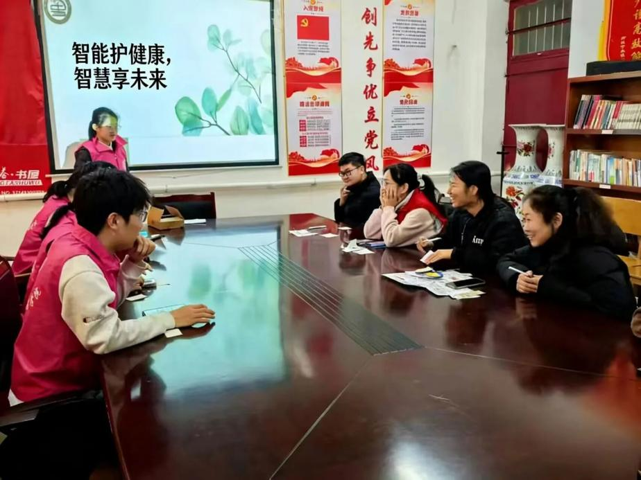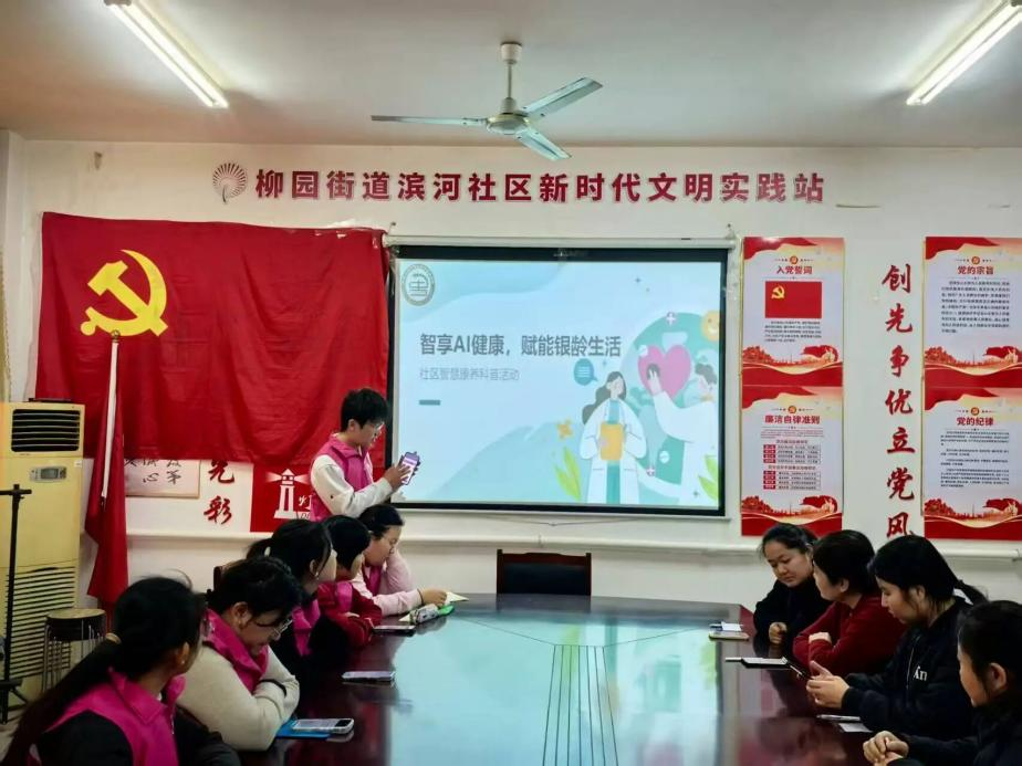 于聊城市东昌府区柳园街道滨河社区举办“银发触AI,健康春常在”活动。 使用介绍环节,志愿者细致介绍手机自带的健康应用程序,通过大屏幕投屏,分步演示应用授权操作,引导群众查看并理解步数、心率、睡眠等健康数据。互动环节中,志愿者引入权威简洁的AI问诊小程序,结合常见症状,耐心指导群众描述身体状况、查看分析结果,帮助群众熟练掌握小程序使用方法。巩固环节,群众对照健康守护手账本,在志愿者协助下完成手机健康功能设置,并手持成果合影留念。 本次活动的顺利举办,不仅拓宽群众社交与信息获取渠道,而且以实际行动推动构建包容友善的科技应用环境,为弘扬新时代风尚注入青春力量。 以青春赋能 凭智算探路 为引导群众树立科学健康管理观念,培养健康生活习惯,推动健康理念融入群众日常生活,近日,第一版主