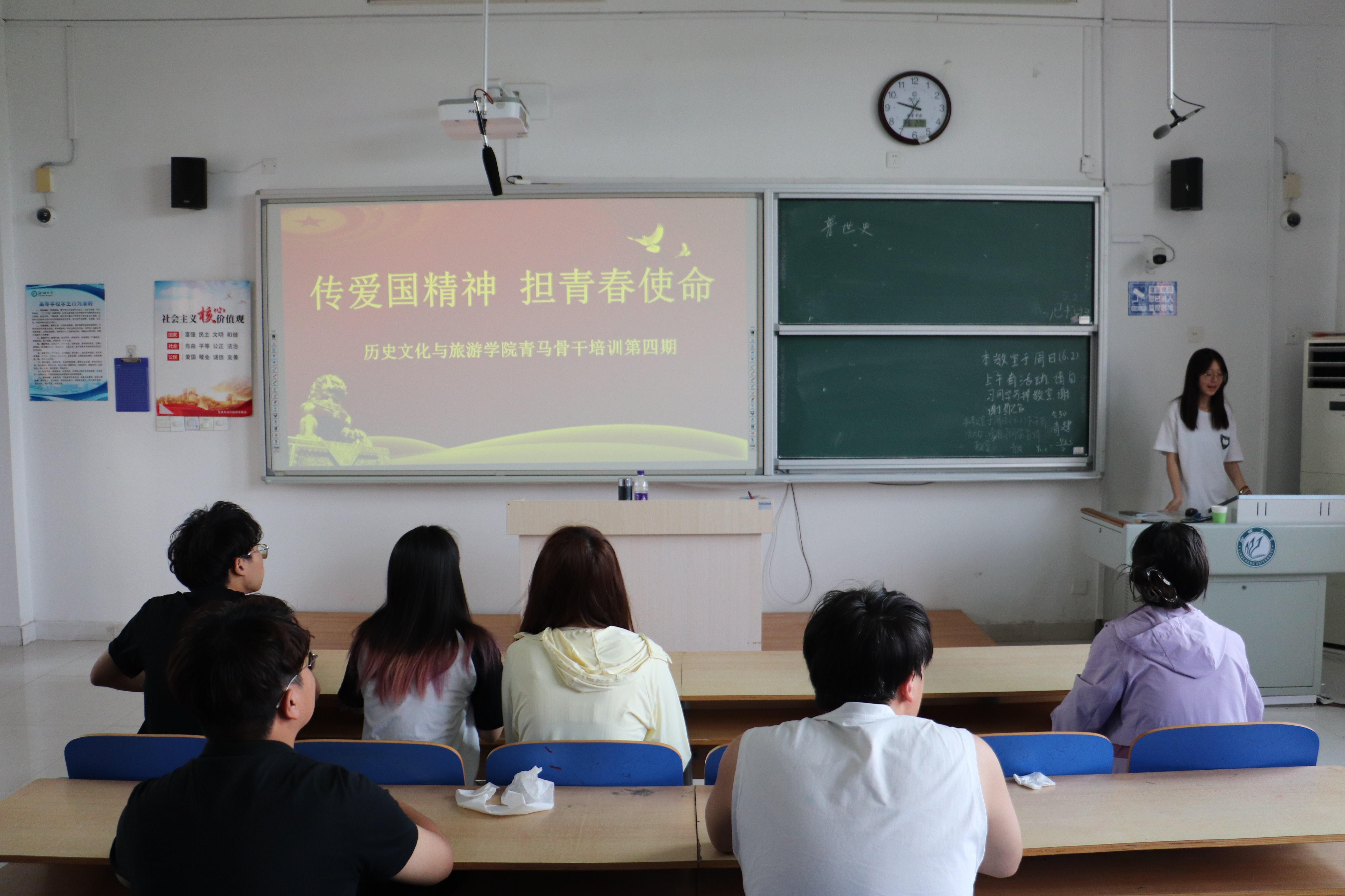 于6#A502教室举办“传爱国精神,担青春使命”第四期青马工程培训会。2022级、2023级入党积极分子参与本次会议。 主讲人围绕回望历史、青年使命、榜样故事三部分先后展开讲解,带领同学们回顾我国各发展阶段的重大历史事件,讲解青年在我国发展进程中所发挥的作用,明确新时代青年应为国家和民族作出贡献的重要方向,并激励同学们厚植家国情怀,不断提升自身能力素养,接续奋斗、砥砺前行,承担起推动国家发展和社会进步、参与全球治理和人类命运共同体建设、践行社会主义核心价值观、关注民生、服务人民、维护国家稳定等使命。 击鼓传花环节中,主讲人围绕公共基础知识进行互动,让同学们进一步加深对我国发展历程的认识,鼓励同学们勇担时代使命,在国家发展、社会进步中贡献青春力量。 主讲人通过播放我国边防一线相关短片,展现中印边境冲突中祁发宝、肖思远等人坚守使命、不惧牺牲的感人事迹,体现其将生命奉献给边防建设、以青春热血回应时代之问的使命与担当,进一步鼓励同学们在面对严峻考验时学习榜样精神,坚定理想信念,砥砺强国之志,实践报国之情。 本期青马工程培训会的顺利举办,有利于引导青年学生在理论学习中筑牢思想之基,在俯首肯干中领悟时代精神,进一步投入到国家发展建设之中。下一步,我院将继续落实立德树人根本任务,充分发挥思政教育育人功能,着力培养一批对党忠诚、信仰坚定、素质优良、作风过硬的青年马克思主义者,推动育人工作有序开展。 (供稿:刘舒雅 摄影:刘舒雅 初审:李月 复审:李友怡 终审:尤姗姗)