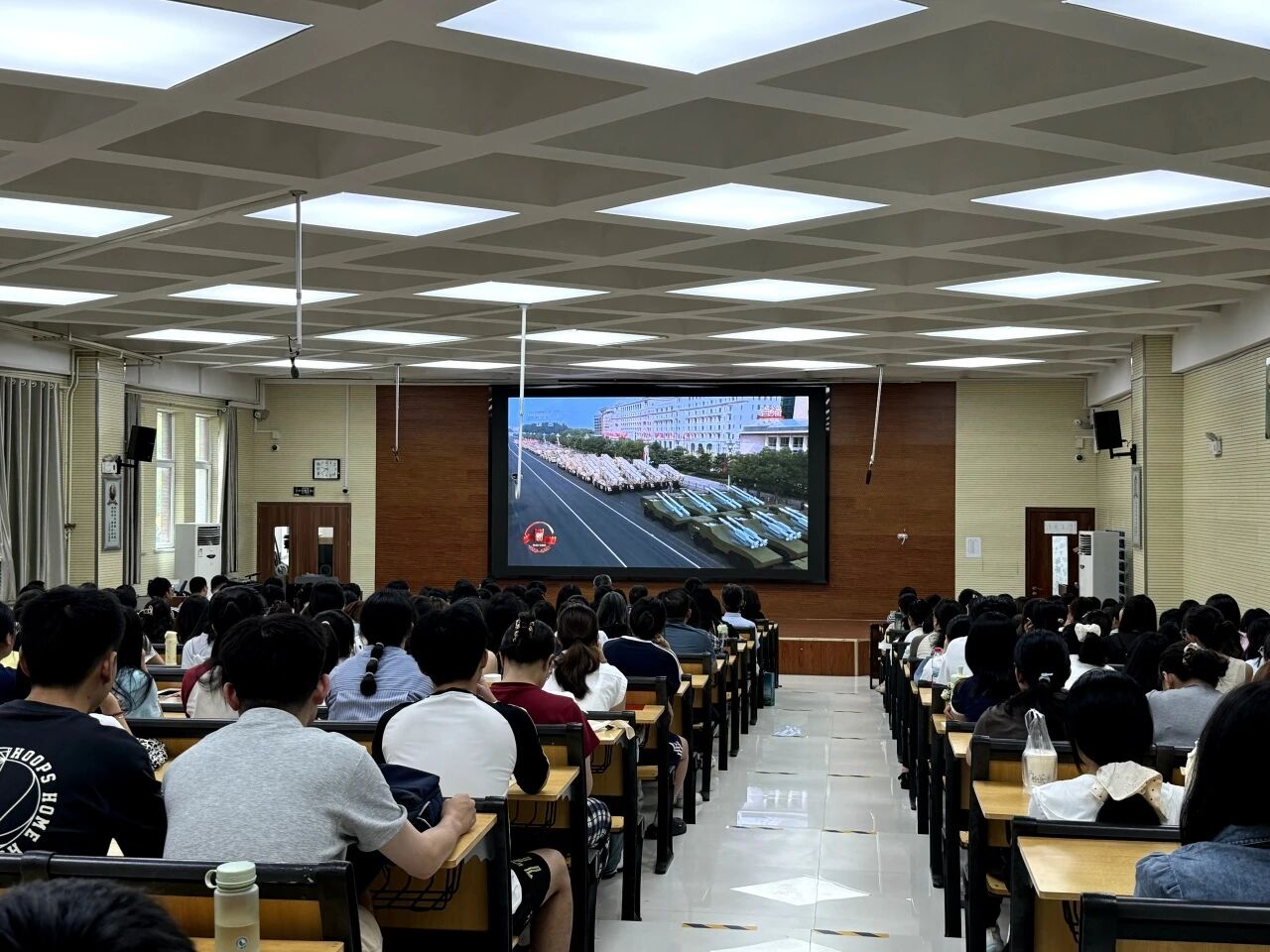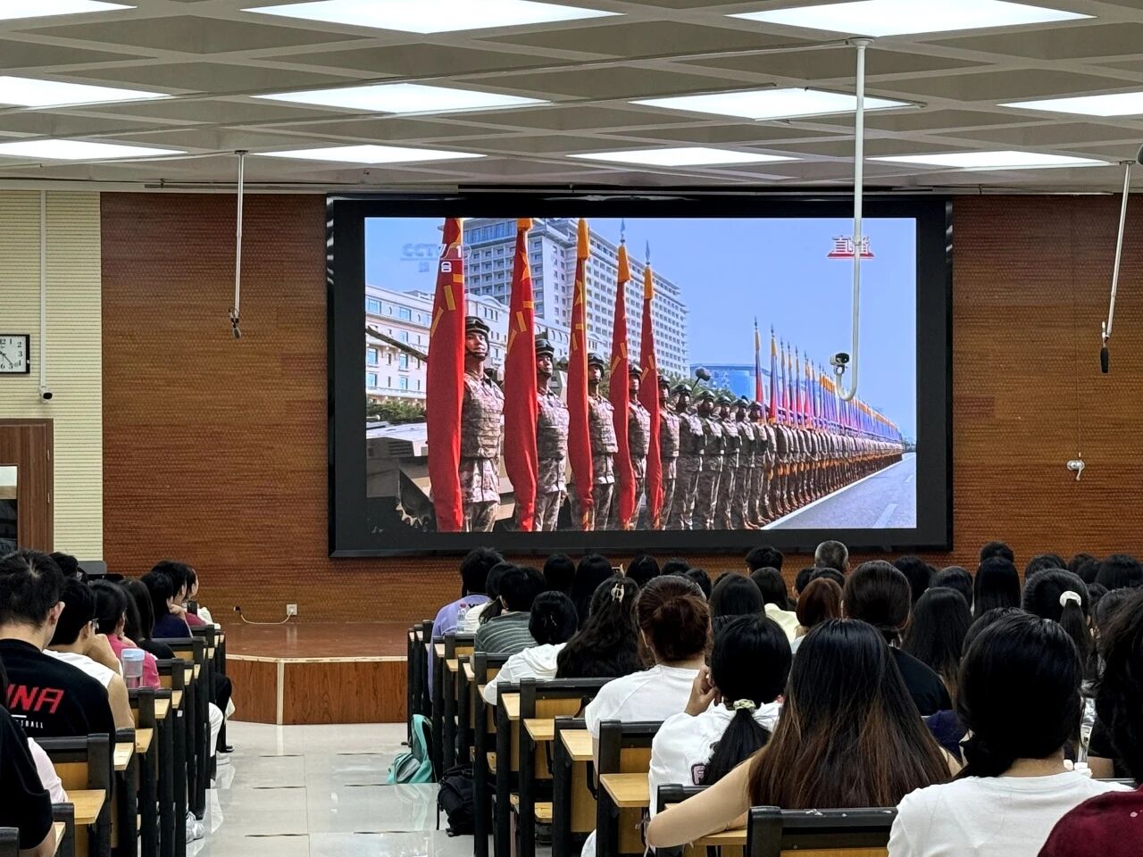 领导班子成员,教师代表,本科生、研究生学生代表参加。 上午9时整,阅兵仪式正式开始。全体师生神情肃穆,目光紧紧聚焦屏幕,全神贯注地观看阅兵式的每一个环节。从迈着铿锵步伐、气势如虹的徒步方队,到铁甲奔流、彰显尖端科技的装备方队,再到鹰击长空的空中梯队,每一个画面都深深震撼着在场师生。他们不时为受阅部队的飒爽英姿鼓掌,为祖国的强大实力喝彩。精彩的阅兵场面,让师生们深切感受到人民军队的强大战斗力,现代化建设的辉煌成就以及国家日益提升的综合国力,民族自豪感与爱国情怀在观看过程中不断升温、愈发浓烈。 此次集中观看活动,是第一版主