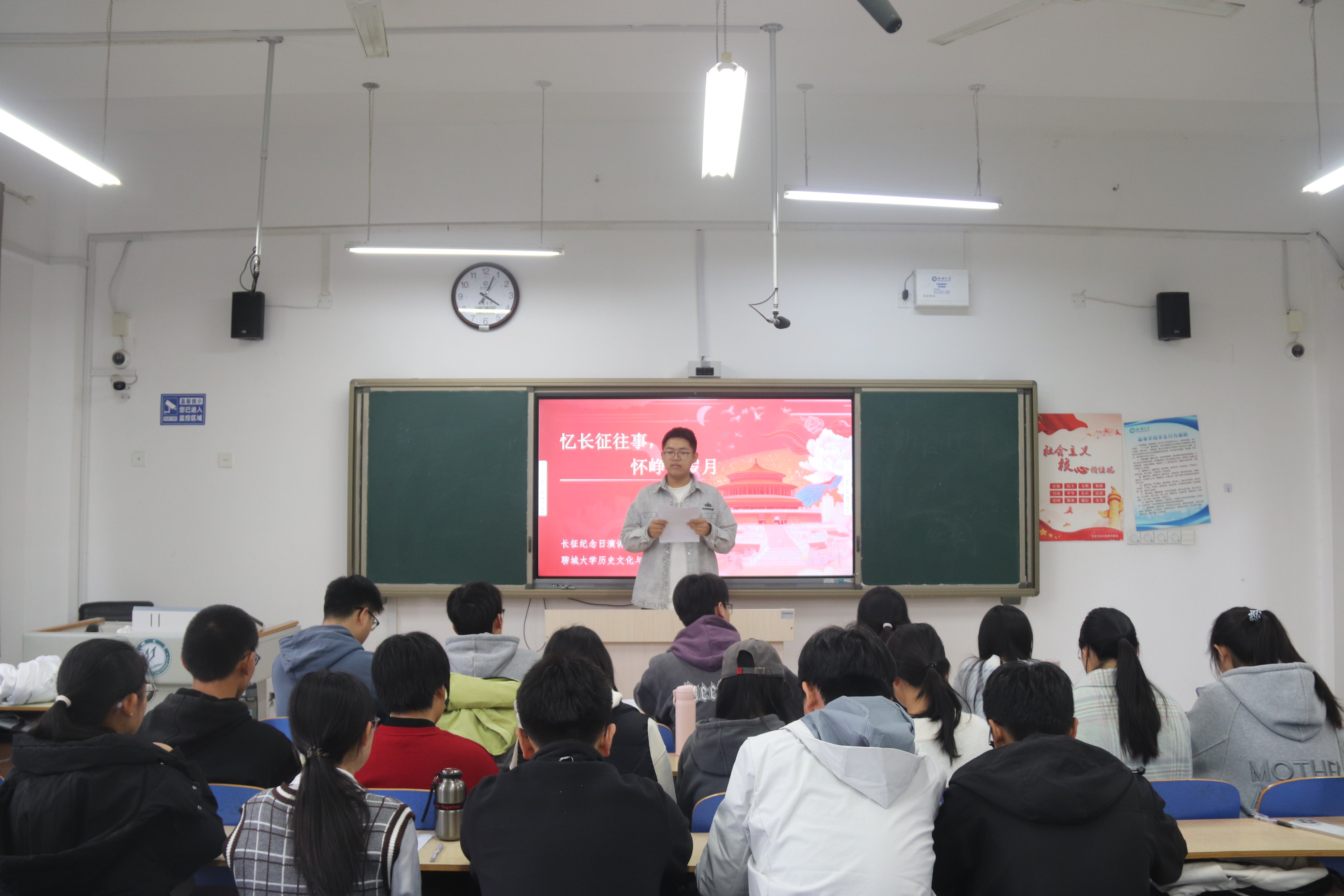 于6#A402教室举办“忆长征往事,怀峥嵘岁月”长征纪念日演讲比赛。 比赛在主持人的介绍中拉开序幕。参赛选手们针对长征的历史背景、英雄壮举及精神内核做了充分准备,凭借饱满的热情与真诚的态度,分享着当年感人故事,生动诠释了长征精神在当下的价值与深远意义。 韩鲁垚在演讲中结合PPT和详实的历史资料,以独特的视角深度剖析了长征途中关键战役背后的战略意义,展现出深厚的历史知识储备。 陈薪茜将自己的感悟与长征精神紧密相连,从生活中的点滴小事出发,阐述长征精神在当代的具体体现。她的演讲亲切自然,让同学深刻认识到长征精神并非遥不可及,而是时刻体现在我们的生活和学习中。 李赫则为大家呈现了长征途中那些鲜为人知的感人故事。他的演讲条理清晰、情感充沛,在讲述故事的同时,还思考着长征精神对个人成长和国家发展的重要意义。 比赛现场气氛热烈,高潮不断。选手们以激昂澎湃的语调、情真意切的表达,将在场观众深深打动。他们发自肺腑的演讲让大家收获满满,感受深刻。经过紧张激烈的角逐,学生评委依据演讲内容、语言表达和情感表达等方面进行综合评分,最终评选出韩鲁垚获得一等奖,陈薪茜、李赫获得二等奖,吕锦超、李作凤、朱怡涵获得三等奖。 本次比赛的顺利举办,不仅为同学们提供了展示与交流的机会,加深同学们对长征历史的了解,而且有利于推动同学们在日常中践行长征精神、坚定理想信念,为成长为社会主义事业接班人凝聚精神力量。 (供稿:黄博雨 侯山山 摄影:王梦 初审:魏志鹏 复审:宋佳珊 终审:尤姗姗)