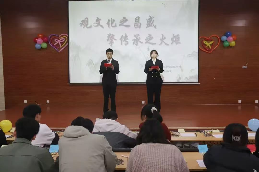 于6#A106报告厅举办“观文化之昌盛,擎传承之火炬”传统文化知识大赛决赛。 本次比赛分为传统文化PPT讲解和传统文化知识竞答两个环节。在精彩的开场舞后,第一环节的比赛正式开始。其中,张筱雅提到已有一千多年历史的绒花,寓意吉祥、祝福,是承载中华民族悠久历史与独特审美情感的非物质文化遗产,在新时代展示出独特的魅力。管章妍围绕探索中华文化的根与魂,介绍中华文化的形成与发展,从多元一体、兼收并蓄的传统文化中挖掘中华优秀传统文化在政治、科技、教育等方面的成就。第一回合结束后,步入“天选之子”游戏环节,现场气氛热烈融洽。 紧接着,比赛进入到第二环节——传统文化知识竞答,参赛选手摩拳擦掌,跃跃欲试。竞答环节在锻炼参赛选手应变能力的同时,又考察了参赛选手对传统文化的理解。经过激烈角逐,张筱雅获一等奖,魏乾蚨、管章妍获二等奖,陈邱媛、王淑雅、李迎雪获三等奖。 本次传统文化知识大赛的顺利举办,不仅有利于激发同学们对中华优秀传统文化的兴趣,增强其对中华民族的认同感和自豪感,还有利于推动同学们从优秀传统文化中汲取智慧与力量,促进学院文化建设。 (供稿:郭俊霞 摄影:郭俊霞 初审:于舒然 复审:张程程 终审:尤姗姗)