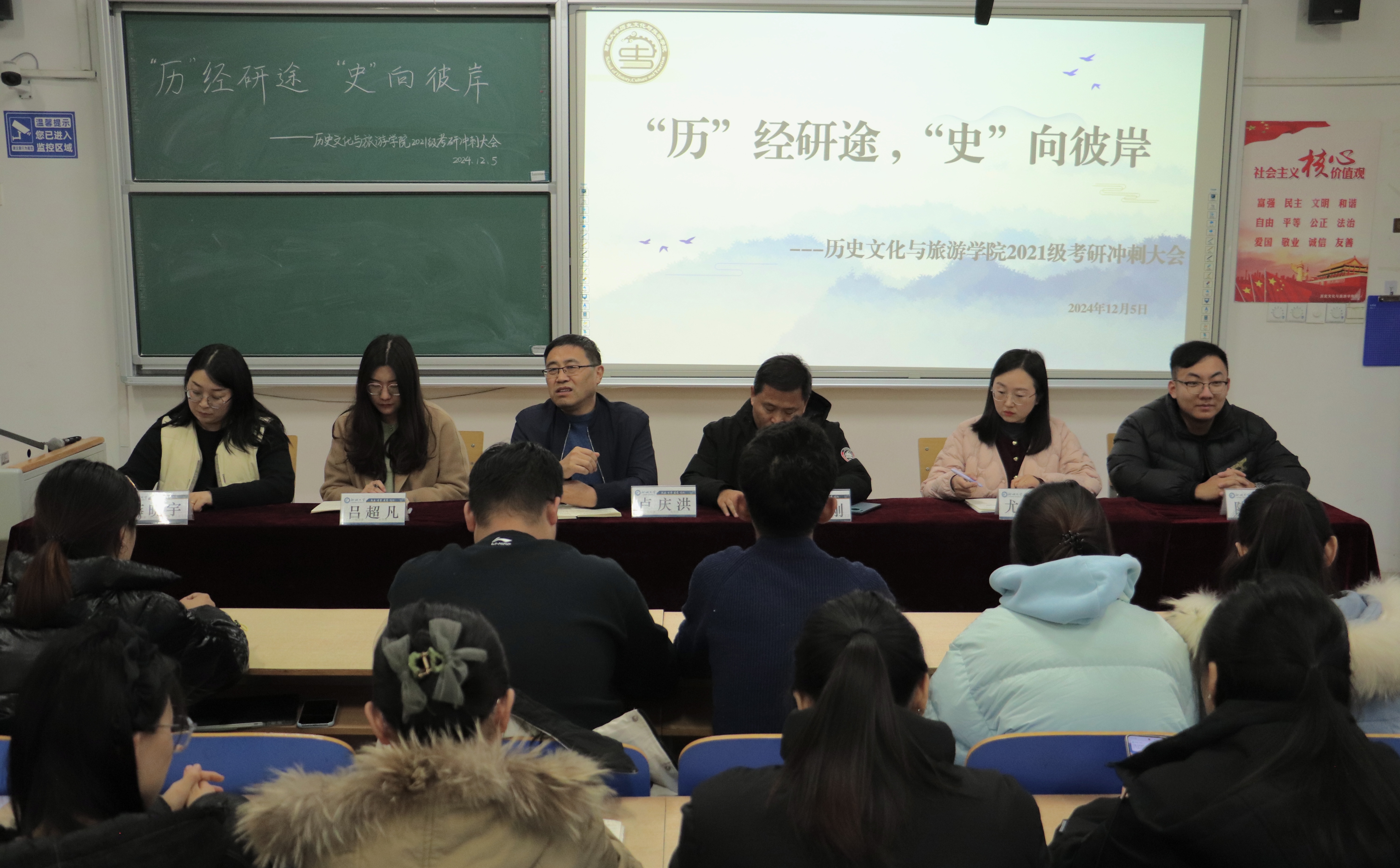 于6#A503教室举办2021级考研冲刺大会。学院党委副书记、副院长卢庆洪,副院长官士刚,及辅导员、班主任出席会议,2021级全体考研学生参加大会。本次大会由薛晓宇主持。 卢庆洪为考研同学送上三点期望:一是强化心理调适,构建积极备考心态,合理分配时间与任务,提升学习效率。二是树立坚定信念,强化自我激励,不断增强抗压能力,优化备考策略。三是锻造健康体魄,做到劳逸结合,提升备考质量,保证以充足的精力迎接未来的挑战。 官士刚就当前的考研形势进行分析。他强调,引导和服务本科生考研是学院教育教学和人才培养的一项重要工作,是推动学风建设的重要抓手和有效举措。未来,学院将进一步完善考研服务体系,为同学们提供全面细致的支持与服务。 各位老师结合自身经历,依次为同学们鼓劲,并呼吁同学们保持良好心态,科学合理进行备考,祝愿同学们顺利考入心仪院校。同学们纷纷表示对当前的考研形势和备考工作有了深入了解,接下来将以坚定的信念和饱满的精神投入考研备战中。 本次大会的顺利举办,有助于为考研同学提供规划性指导,明晰冲刺方向,营造积极向上的考研氛围。下一步,学院将从多层面、多维度、多阶段提供精心指导和全过程服务保障,提升同学们的备考效率和综合素质,助力考研深造蔚然成风。 (供稿:张炳举 初审:宋佳珊 复审:张程程 终审:尤姗姗)