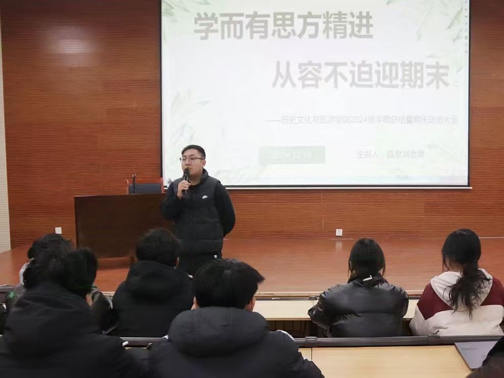 于6#106报告厅召开“学而有思方精进,从容不迫迎期末”期末动员大会。本次会议由辅导员陈泉润主持,2024届全体学生参加。 陈泉润对期末考试的重大意义进行深入阐释。他指出,期末考试不仅是对同学们整个学期学习成果的全面检验,更是一次实现成长进步的关键契机。同学们要端正心态,踏实备考,严守校规校纪及考场纪律,为共筑公平公正学风贡献力量。同时,他提到劳逸结合的重要性,提醒同学们在紧张复习的过程中,务必保证充足的休息以及适当的运动。 陈泉润对期末考试注意事项、违纪作弊行为认定办法等作详细讲解,进一步明确考试纪律的高压线,强调诚信考试的必要性,警示同学们务必严守考试规则。大会进入尾声,陈泉润鼓励同学们以饱满的热情、认真的态度和科学的方法投入到复习当中,以积极的心态看待期末考试,做好相应的考试准备工作。同学们纷纷表示自己在大会中受益匪浅,未来将会切实提高学习的自主性和自觉性,助力个人综合素质的全面提升。 本次活动的顺利举办,不仅有利于帮助同学们明确学习目标,引导其从思想上高度重视期末考试,树立诚信应考的理念,而且有利于进一步营造良好考试环境,以实际行动诠释学院诚信育人的教育宗旨,为树立优良学风、创建和谐校园打下坚实基础。 (供稿:陆雅馨 摄影:刘雪睿 初审:宋佳珊 复审:李月 终审:尤姗姗)