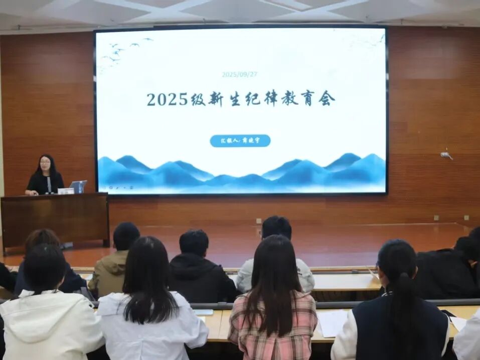 于6#106报告厅举办2025级新生纪律教育会。本次会议由2025级新生辅导员薛晓宇担任主讲人,全体2025级新生参与。 会上,薛晓宇表示,作为2025级新生的辅导员,她不仅全面负责同学们的各项事务,包括学风建设、评奖评优、纪律监督、卫生检查以及学生资助管理等工作,还持续关注每位学生的心理健康成长,积极落实相关支持措施,努力打造一个温暖、有序的学习与生活环境。 她还要求同学们牢固树立纪律意识,严格遵守校纪校规,自觉规范日常行为,尽快完成从中学到大学的思想转变与角色适应,并珍惜学习机会,合理规划时间,积极参与集体建设,共同营造积极向上的成长氛围。 关于新学期学生工作安排,薛晓宇指出,她将协同班主任共同推进班级建设与学风管理,定期开展主题教育与成长辅导,加强学生综合素质评价与评奖评优工作的规范性与引导力,完善困难学生帮扶机制,做好思想引领与价值塑造,全面促进学生的成长发展。 此次见面会的召开,不仅帮助新生明确了辅导员的工作职责和学院的管理要求,也有助于他们树立积极的学习态度与清晰的发展目标,为顺利开启大学生活提供了重要指导。 (供稿:郭艺泽 初审:魏志鹏 复审:张程程 终审:尤姗姗)