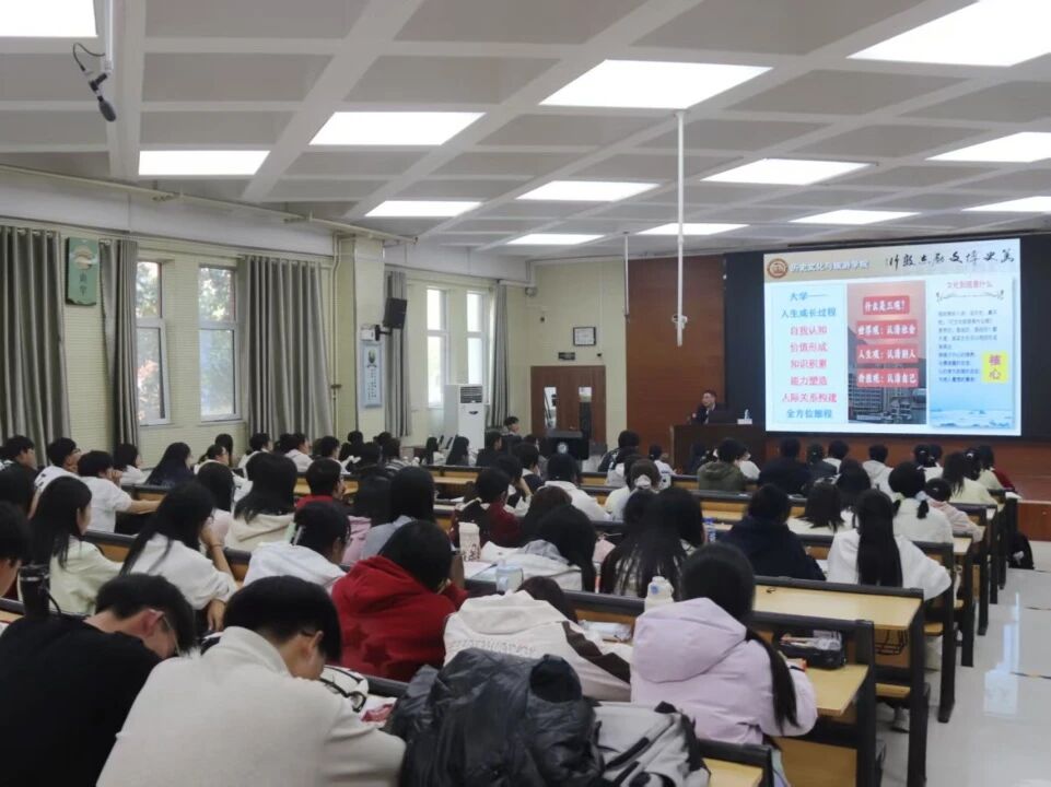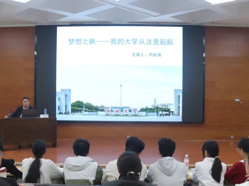 党委副书记、副院长卢庆洪担任主讲人,2025级全体新生参与。 卢庆洪代表学院对新生的到来表示热烈欢迎,并结合高校人才培养规律,深入解读大学“思想摇篮”与“成长平台”的双重定位,引导新生以更宏观的视角思考大学生活的意义。他强调,大学阶段相较于其他教育阶段更具自主性与探索性,鼓励新生尽快完成从“被动接受”到“主动建构”的学习方式转变。 在新生入学指导中,卢庆洪围绕入学适应与校园安全展开讲解,为新生梳理成长与防护要点。他建议新生跳出中学“唯分数论”的认知,理解大学综合评价里学业成绩和个人表现同样重要,遇到心理或学习上的困惑时,要主动向学院老师寻求帮助,同时多熟悉图书馆、就业指导中心等校园资源,积极参与学科竞赛和社会实践,在接触不同平台的过程中拓宽视野、提升综合素养。 卢庆洪指出,大学不仅是积累专业知识的场所,更是培养思维方式、树立正确价值观、提升人格素养的关键阶段。此外,他还专门讲解校园安全要点,重点提醒新生警惕诈骗行为,增强安全意识,从入学之初就为大学生活筑牢安全防线。 本次讲座不仅帮助新生明确了大学生活的核心方向、缓解了入学焦虑,更有效激发了他们的学习热情与奋斗动力,为新生顺利完成角色转变、开启高质量大学旅程奠定了坚实基础。 (供稿:郭艺泽 摄影:郭艺泽 初审:魏志鹏 复审:宋佳珊 终审:尤姗姗)