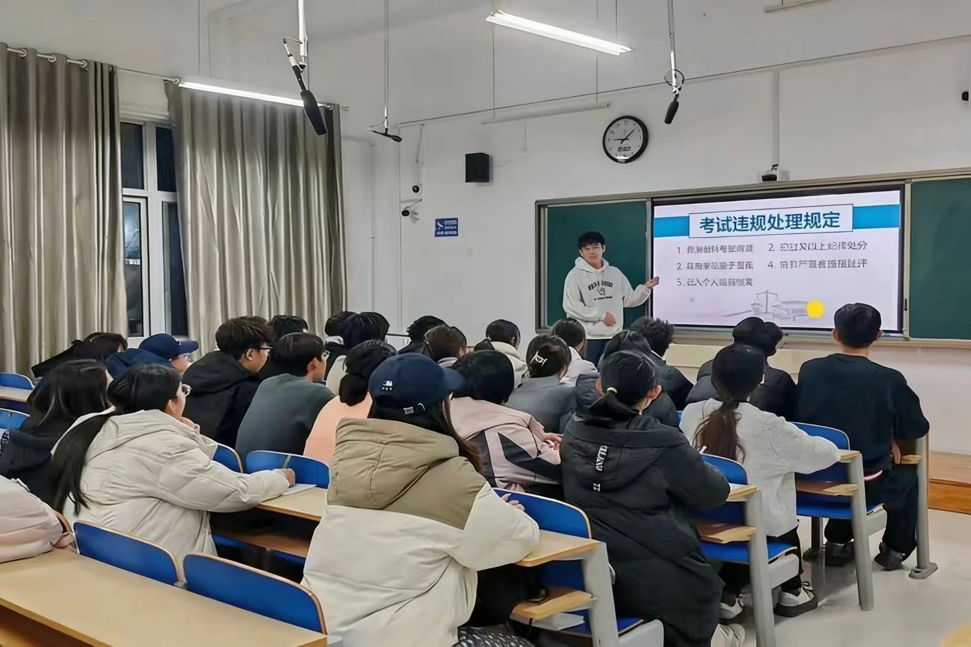 于6#A305教室举办“以诚信执笔 绘就合格答卷”四六级考风考纪倡议活动。 活动紧扣考风考纪教育核心,优秀学生代表率先围绕考风考纪建设的重要意义展开解读,深刻阐明严守考纪是维护考试公平公正的关键前提,更是培育学生诚信品质、营造优良学术氛围的内在要求。同时,学生代表还明确界定携带通讯工具、抄袭作弊、违规替考等违纪行为,并详细宣讲相关处理规定,为全体学生敲响纪律警钟。 活动现场氛围庄重有序,全体参与学生依次签署《诚信考试承诺书》,并集体宣读诚信考试倡议书。铿锵誓言传递出学子们拒绝舞弊、公平竞争的坚定决心,进一步夯实了诚信应考的思想自觉。互动答疑环节中,学生们围绕四六级考试流程、规则细则、应急处理方式及备考重点等疑问踊跃提问,现场工作人员结合考试要求逐一耐心细致解答,精准回应学生关切,帮助学生全面掌握考纪要点与备考关键,确保考纪要求真正入脑入心、见行见效。 此次活动将考纪教育与学风建设深度融合,既全面覆盖核心教育要点,又以丰富形式提升教育实效。在此,学院殷切期望全体考生秉持诚信之心,沉着应战、从容作答,用真实成绩书写青春答卷。预祝各位学子旗开得胜,顺利通过考试,让诚信之花绽放在逐梦征程的每一站。 (供稿:王彤 张旭 摄影:第一版主