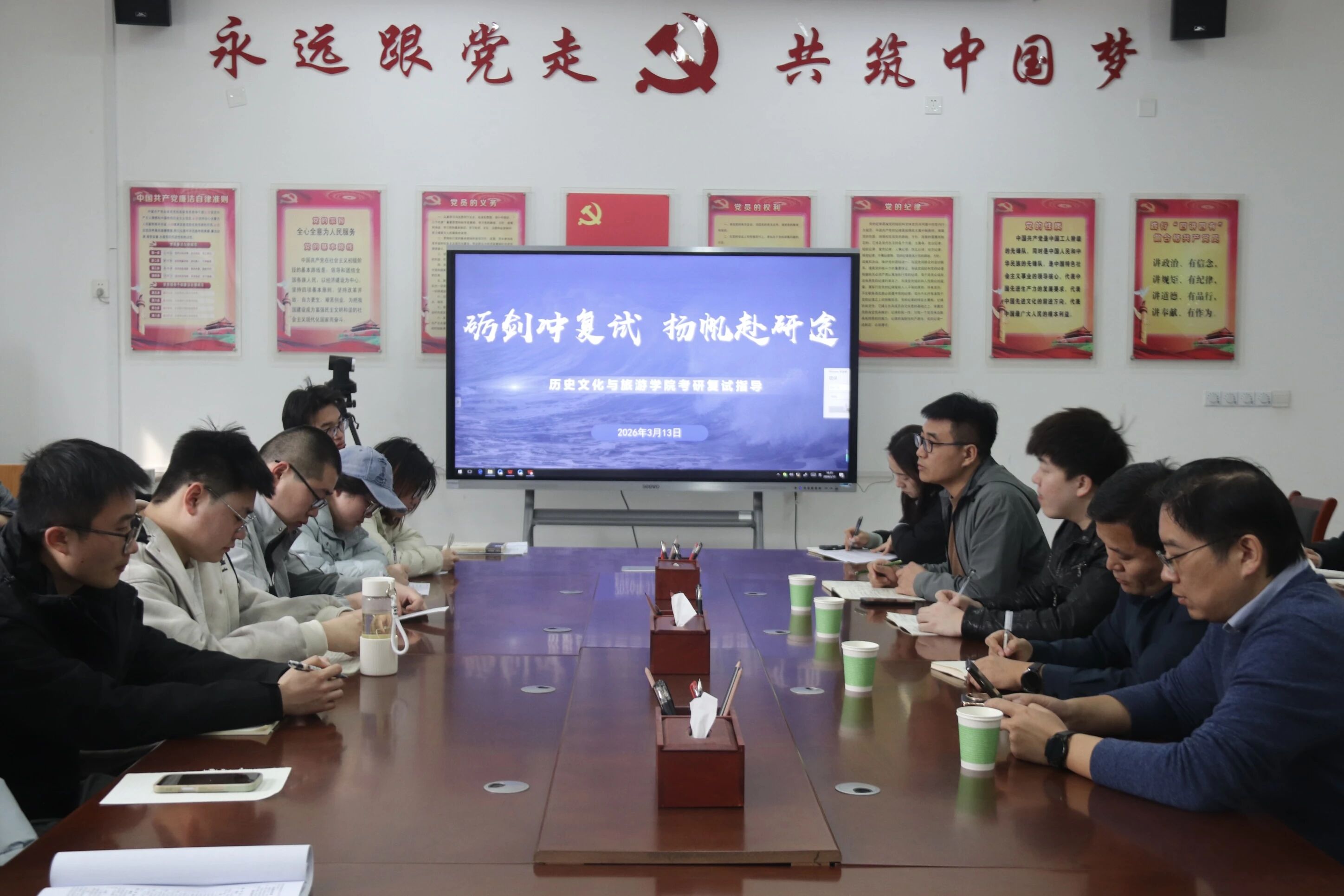 于6#104会议室举办研究生复试指导活动。学院副院长官士刚,历史系主任吕俊昌,科研秘书倪鹏,班主任代表孙云之鹏出席本次活动。本次活动由石晓晗主持。 在专业知识备考指导活动中,吕俊昌提醒同学们重点突出个人学术研究成果与专业学习积累,展现严谨的逻辑思维与得体的表达能力。倪鹏强调,面试不仅是对专业知识的考察,临场状态、礼仪细节与沟通态度同样至关重要。孙云之鹏建议同学们理性对待考官追问,英语复试中勇于开口表达,以充分准备应对复试与调剂全流程。 现场答疑环节,同学们围绕分数定位、调剂院校选择、导师沟通技巧等问题积极提问。老师们逐一细致解答,帮助大家厘清备考思路,明晰复习方向。 官士刚在总结中提出,同学们可结合目标院校优势方向、专业期刊及研究报告把握备考重点,精准贴合报考需求;选择导师前,提前了解其研究领域;同时充分依托本校专业优势,在复试与调剂中打造核心竞争力,牢牢把握每一个升学机会。 本次活动的顺利开展,既帮助同学们有效缓解备考冲刺阶段的困惑与压力,又打通了信息壁垒、减少备考误区,切实助力学生成长成才、实现升学与发展目标。 (供稿:张诺 陆雅馨 摄影:张诺 陆雅馨 初审:陆雅馨 复审:宋佳珊 终审:尤姗姗)