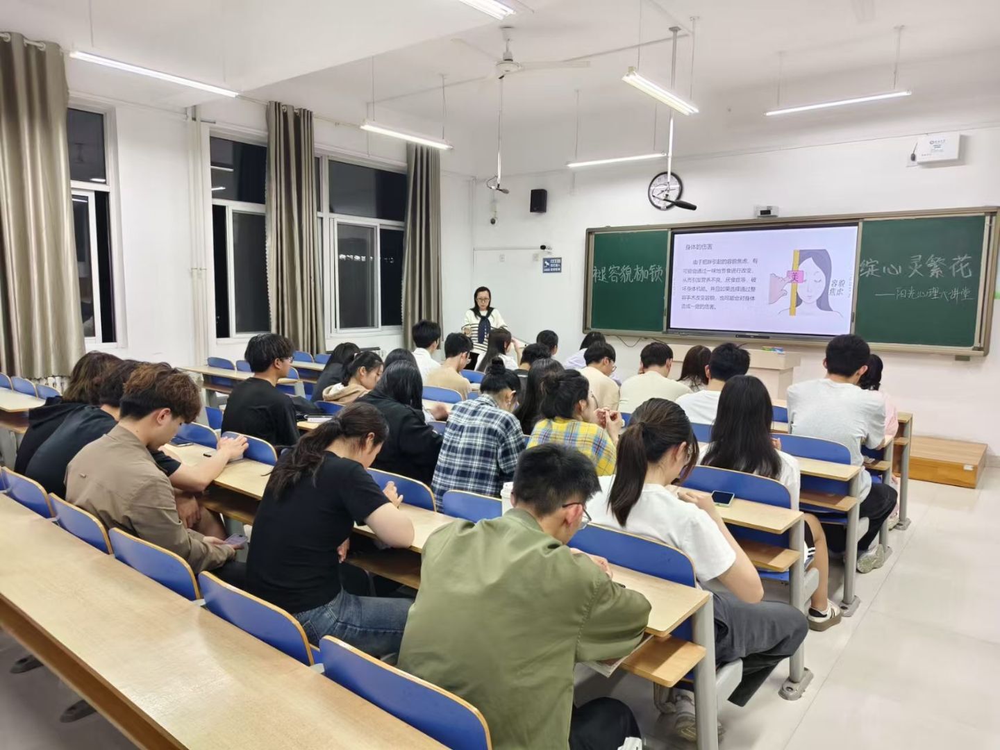 为引导同学们正确认识容貌焦虑,破除单一审美桎梏,提高他们的心理健康水平与生活质量,4月19日,我院于6#A305教室举办“褪容貌枷锁,绽心灵繁花”阳光心理大讲堂活动。活动邀请饶银萍老师担任主讲人。 饶银萍老师通过邀请两位同学在黑板上绘制自画像的互动方式,生动有趣地开启了本次讲座。这一开场形式不仅自然而然地引出了活动主题,更让现场师生距离迅速拉近。在随后的讲解中,饶银萍老师从专业心理学角度出发,系统剖析了容貌焦虑背后的形成机制。她指出,当前社交媒体通过算法推送形成的“网红审美”范式,正在构建封闭的审美认知体系,导致大众对美的理解日趋单一。为深化理解,饶银萍老师特别选取了具有代表性的社会热点案例,通过深入剖析,引导同学们认识到容貌焦虑背后的社会心理成因,激发他们对多元审美的深入思考。 在互动环节,饶银萍老师积极引导同学们分享个人经历,现场交流氛围热烈。在交流过程中,饶银萍老师还结合自身经历,以亲身体会和经验引导同学们打破容貌枷锁、拒绝容貌焦虑。对此,不少同学表示,通过此次活动他们不仅对自我价值有了更加深刻的认识,同时也对未来的学习与生活充满了信心和期待。 此次心理大讲堂的顺利举办,不仅有利于帮助同学们建立正确的自我认知,增强他们的心理韧性,更有助于营造积极健康的校园心理环境,为培养身心健全的新时代大学生奠定坚实的基础。 (供稿:王梦 朱紫藤 摄影:心理健康发展中心 初审:王舒心 复审:李月 终审:尤姗姗)
