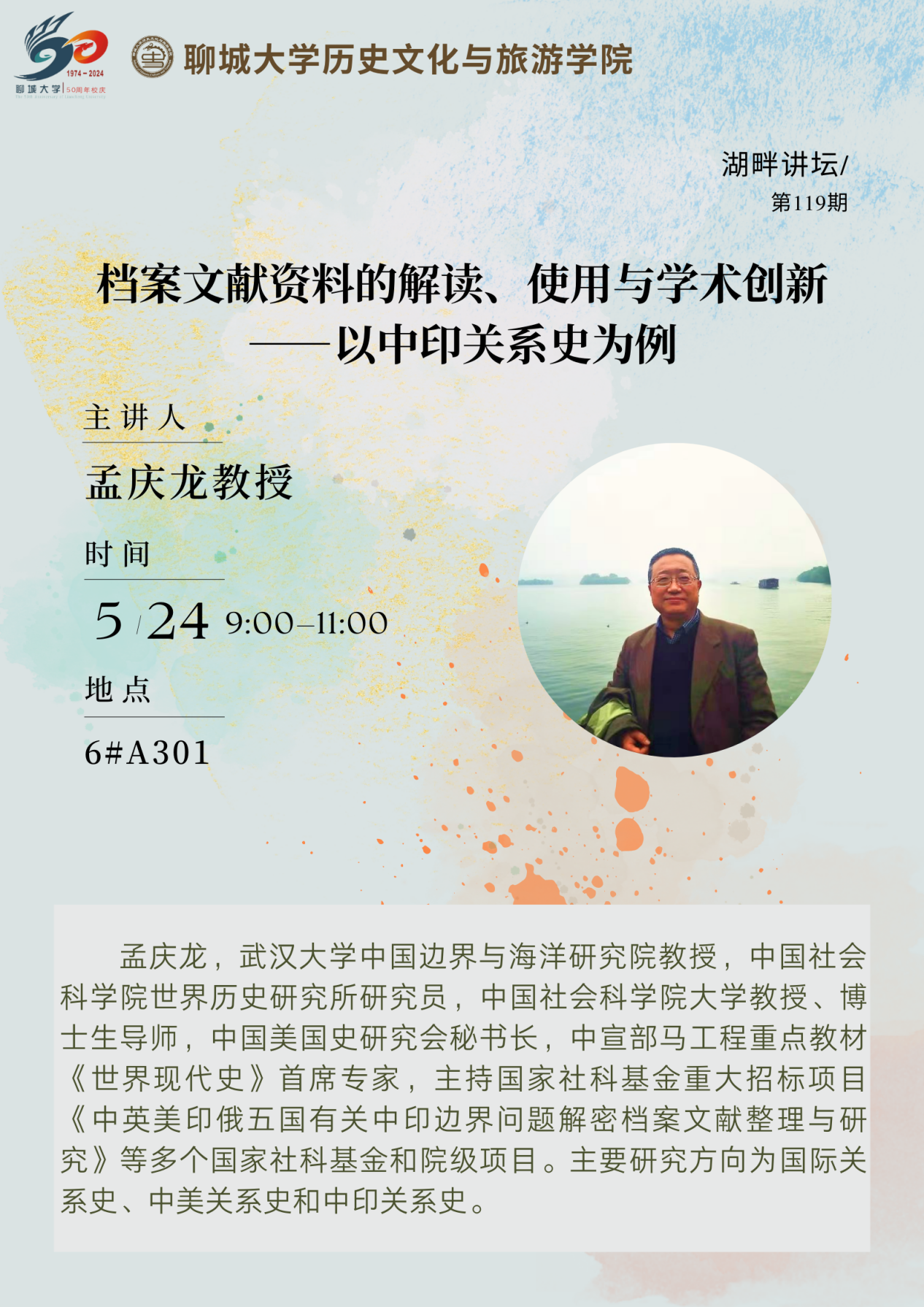 主题:档案文献资料的解读、使用与学术创新——以中印关系史为例 主讲人:孟庆龙 时间:2024年5月24日上午9:00-11:00 地点:6#A301 主讲人简介 孟庆龙,武汉大学中国边界与海洋研究院教授,中国社会科学院世界历史研究所研究员,中国社会科学院大学教授、博士生导师,中国美国史研究会秘书长,中宣部马工程重点教材《世界现代史》首席专家,主持国家社科基金重大招标项目《中英美印俄五国有关中印边界问题解密档案文献整理与研究》等多个国家社科基金和院级项目。主要研究方向为国际关系史、中美关系史和中印关系史。