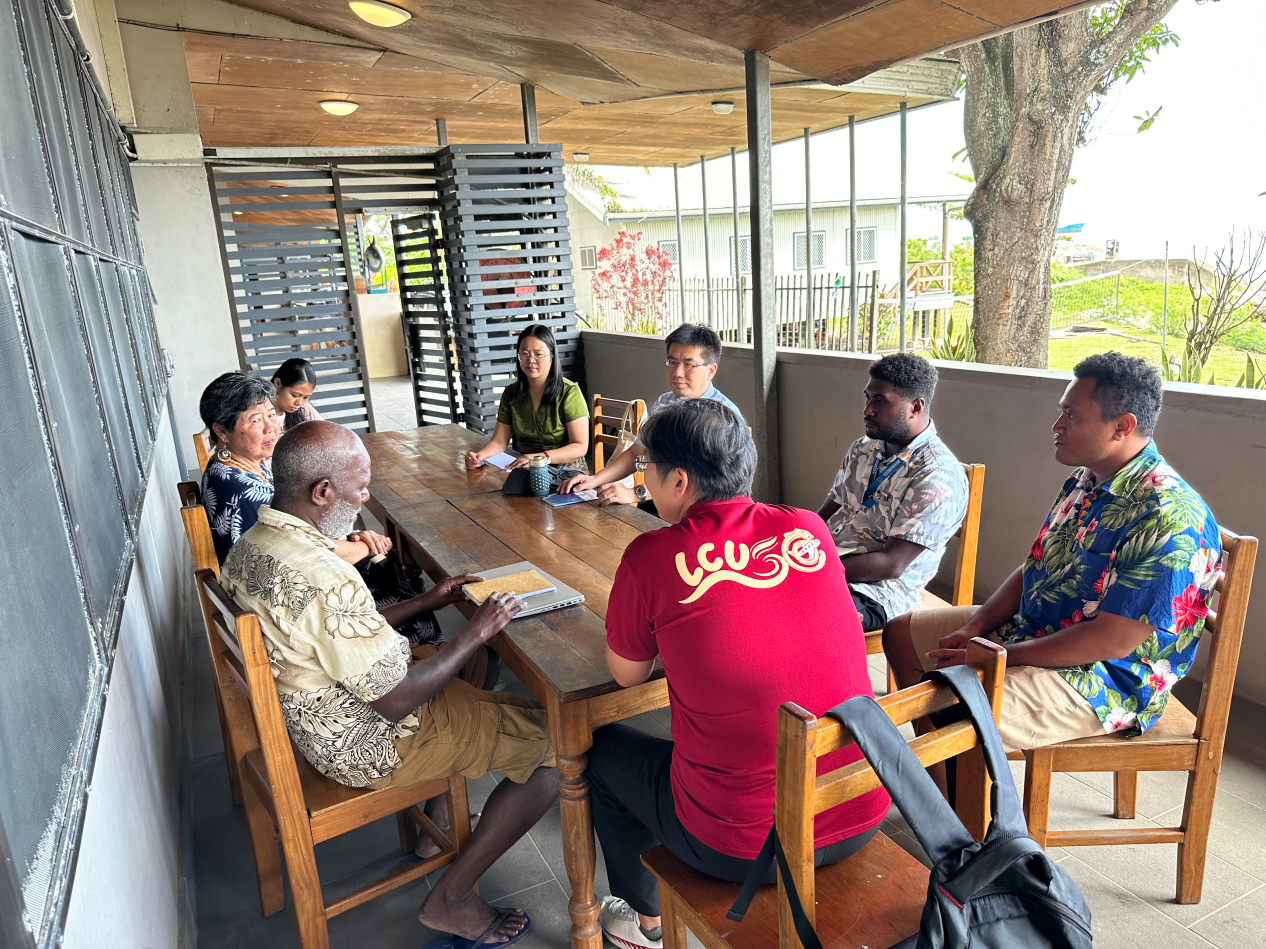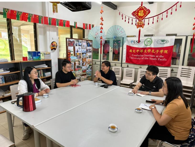 区域国别研究院等大力支持。 校际交流成果显著 在瓦努阿图理工学院、南太平洋大学瓦努阿图分校、南太平洋大学所罗门群岛分校和所罗门国立大学等教育机构的校际交流中,团组与各校领导进行了深入座谈,就师生交流、科研合作及校企合作模式等议题达成共识。 在瓦努阿图,团组访问了南太平洋大学孔子学院艾玛卢校区孔子课堂,并与公派教师崔惠琼、乔亚晓进行了座谈。此次深入交流旨在了解当地的汉语教学与推广情况,并探讨中国高校如何进一步支持孔子学院在瓦努阿图社区的深入发展。崔惠琼和乔亚晓老师分享了他们在汉语教学中的经验和面临的挑战,同时表达了对加强中瓦文化交流的积极态度。团组还前往瓦努阿图理工学院,与后勤部负责人Jacob进行了深入交谈。Jacob详细介绍了学院的教师、学生及学科发展情况。尽管目前该学院尚未有中国教师参与教学工作,但Jacob表达了对中国教师未来加入的期盼。在所罗门群岛,团组与所罗门国立大学执行副校长Eric、环境系主任John、经济与旅游系主任Jerry、自然资源系负责人Lyndon、所罗门群岛渔业部Miechlle Lam等专家联合举行第三届小岛屿国家可持续发展论坛。大家围绕主要关切的气候问题展开了讨论,双方就未来的合作方向进行了深入交流。所罗门群岛国立大学期盼与第一版主