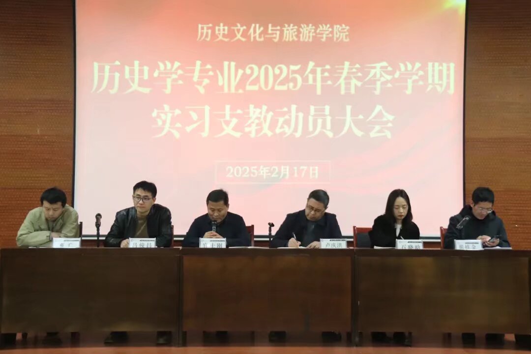 于6#A106报告厅召开2022级历史学专业实习支教动员大会。学院党委副书记卢庆洪、副院长官士刚、历史系主任吕俊昌、团委书记石晓晗和指导教师翟桂金、邓广出席本次会议。会议由翟桂金主持。 会上,官士刚代表学院发表动员讲话,他对2022级全体历史学专业同学的实习支教提出三点要求,一是明确实习工作的意义,完成三个“转变”,即从学生身份到教师身份的转变,从知识输入到能力输出的转变,从理想到现实成长的转变;二是脚踏实地,求真务实,发挥自己的能力,虚心向老师学习教学经验和管理经验,全身心投入教学工作;三是严格遵守支教学校的规章制度,保障好个人安全,与学校积极沟通交流。 卢庆洪强调,实习支教是师范生培养的重要环节,是理论与实践相结合的关键途径。他对实习支教学生提出三点要求:一是明确实习目的,增强实习信心,提高个人能力,为日后工作打下坚实基础;二是主动融入支教学校,实习期间与指导老师及时沟通联系,通过参加支教学校的集体备课了解现实课堂教学要求,积累教育经验;三是要加强人际交往,面临全新的人际环境既要学会迅速融入,遵守实习纪律,服从工作安排,守住工作道德底线。此外,卢庆洪还嘱咐同学们在安全方面要多加注意,保障自身安全。 石晓晗勉励全体支教实习生要珍惜机会,在实践中锤炼本领,以高度的责任感和使命感投身教育事业,为学生带去优质的教育资源。她强调,支教不仅是一次教学实践,更是一次心灵的洗礼。她鼓励实习生们以爱心、耐心和责任心对待每一位学生,用实际行动践行教育初心。 吕俊昌指出,当前就业形势严峻,实习支教与考研皆为提升个人能力的重要途径。学生于实习期间应正确认识自我,科学规划人生目标。他深入剖析考研政策变化及考研流程,强调同学们要善用实习支教资源,密切关注形势动态,实现支教与考研并重,着力提升个人能力。 翟桂金进行了政策解读与分析。他指出,实习支教是师范生完成学业的必备课程,也是教师培养的重要环节。他还特别强调了安全问题,要求全体实习生严格遵守纪律,确保人身安全和教学秩序 最后,2021级实习生代表贾永刚、李伶迪发表讲话,二人结合自身实习经历,向同学们分享自己的实习经验。同学们承诺将全力以赴,认真完成教学任务,努力为教育事业贡献自己的力量。翟桂金、邓广对同学们提出的问题进行答疑解惑,帮助同学们进一步了解支教工作的具体事项。 本次动员大会的顺利召开,有利于帮助同学们进一步完成对师范生身份的理解,提高自身责任感,从而为第一版主
