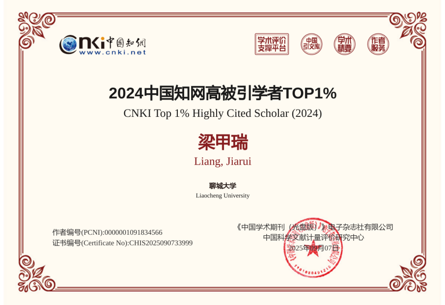 第一版主 教师入选“2024中国知网高被引学者TOP1%”名单