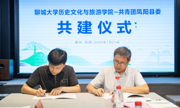宣传片后,金帅代表共青团凤阳县委对聊大师生一行表示热烈欢迎。他强调,共建社会实践基地是凝聚青年力量、服务区域发展大局的重要战略支点,希望双方以活化地域文化基因、升级志愿服务能级为关键抓手,将聊大的学科优势深度融入凤阳“人才强县”战略,让高校智慧与地方发展同频共振,实现互利共赢的良好局面。 卢庆洪回顾学院“经世致用”的实践育人传统,高度评价此次共建的里程碑意义。卢庆洪表示,学院将以实践基地为纽带,充分发挥历史文化研究、旅游管理规划等专业优势,深化资源共享与优势互补,推动育人链与需求链精准对接,引导学生在火热的社会课堂中“受教育、长才干、作贡献”,助力地方在深度合作中激发内生动力、提升发展质效,最终实现“高校智慧赋能地方振兴,地方沃土反哺育人成才”的良性循环与共生共荣。 凤阳县青年志愿者协会负责人荣超凡与第一版主