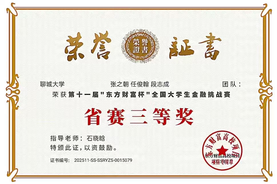家庭经济困难学生2024级1班任俊翰同学所在团队,在本次大赛中荣获省赛三等奖。在学院、学校和国家的资助政策保障下,任俊翰同学能够安心参与专业竞赛培训与备赛,与团队成员共同钻研金融实操技能、优化竞赛策略,最终在赛事中收获佳绩。 本次大赛有利于激发大学生对金融领域的学习兴趣,帮助学生将理论知识转化为实践应用能力,同时促进了学生之间的协作交流,进一步增强了他们的专业竞争意识与团队合作精神。