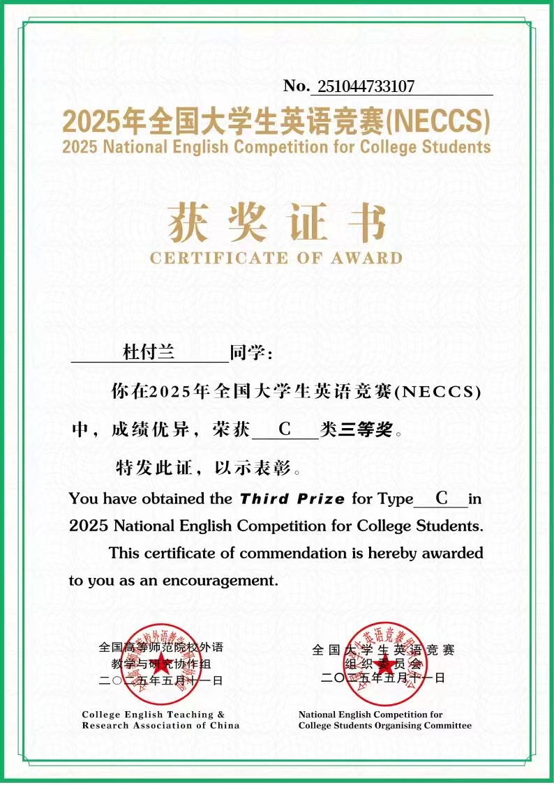 第一版主 学生在2025年全国大学生英语竞赛中荣获C类三等奖