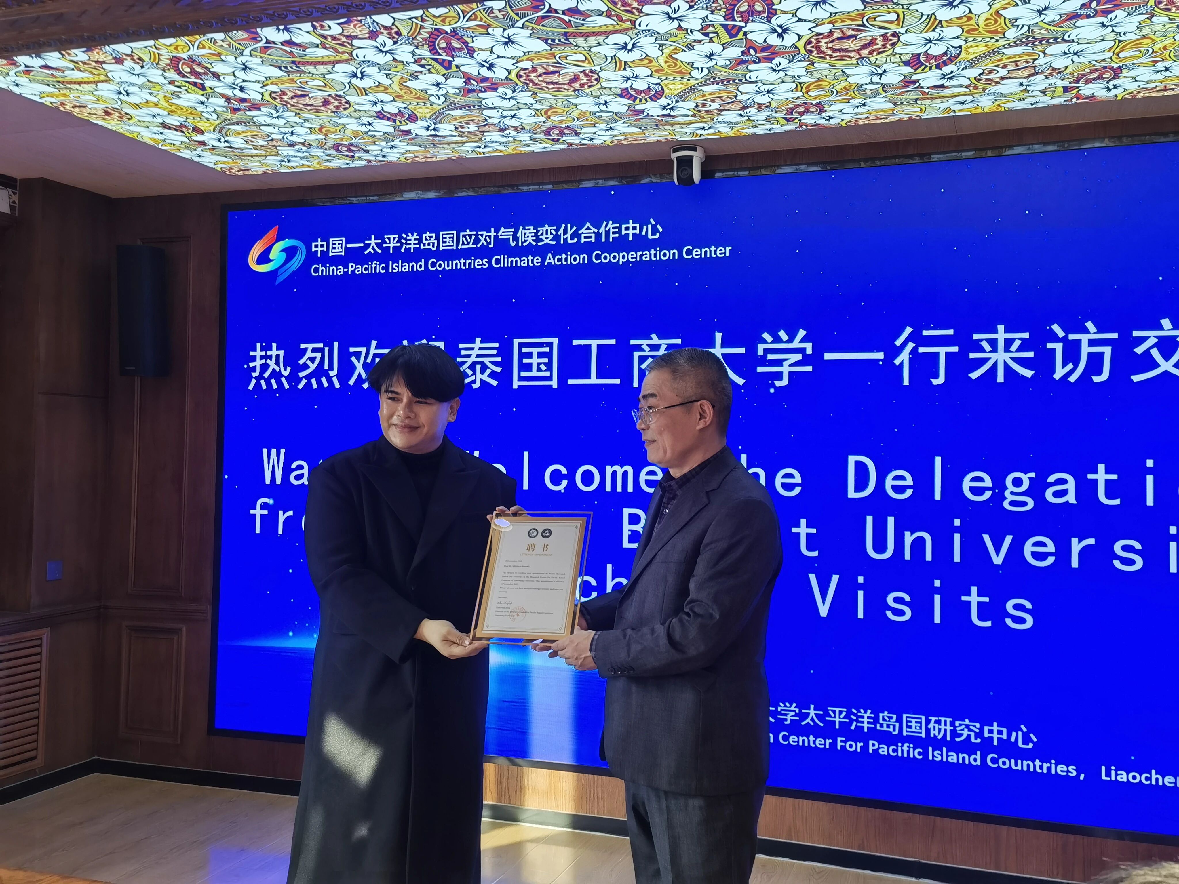 的发展概况,重点阐述了太平洋岛国研究中心在建设历程、教学科研、人才培养等方面取得的成果。太平洋岛国研究中心副主任刘建峰详细介绍了中心的发展现状,分享了中心在推动跨学科融合、深化实地调研、促进校企合作等方面的经验与成绩。商学院、外国语学院及国际教育学院副院长分别结合各自学院的学科优势与发展规划,就与泰国工商大学开展合作交流、共建特色项目等话题进行了探讨。 斯蒂丘克院长介绍了泰国工商大学的办学历程与校训理念,着重阐述了学校在学科建设与国际化发展方面的特色,并分享了其在教育国际合作领域的经验与资源。他对太平洋岛国研究中心在服务国家战略、支持区域发展与学术研究方面取得的成果给予了高度评价。 穆尚海副院长进一步介绍了该校在人才培养与学科建设方面的优势。他指出,学校秉持“实践赋能+国际适配”双导向,构建了“理论教学+企业实训+跨文化实践”一体化培养体系,着力提升学生的跨文化沟通能力与岗位实践技能。学校聚焦酒店管理、国际教育等优势学科,打造了多层次课程体系与高水平科研团队,形成了学科特色鲜明、国际对接紧密的发展格局,并依托广泛的国际合作网络,可为两校联合培养与学术交流提供有力支持。 会上,陈传利向斯蒂丘克颁发聘书,聘任其为研究中心特约高级研究员。双方围绕合作办学模式创新、学术成果共享、学生联合培养等议题展开热烈讨论。双方一致认为,两校在办学理念与发展需求上高度契合,合作前景广阔,并表示将以此次交流为契机,深化多领域协作,共同培养具有国际视野的复合型人才。 来自外国语学院日语系主任林娜、商学院王腾博士参加座谈交流。