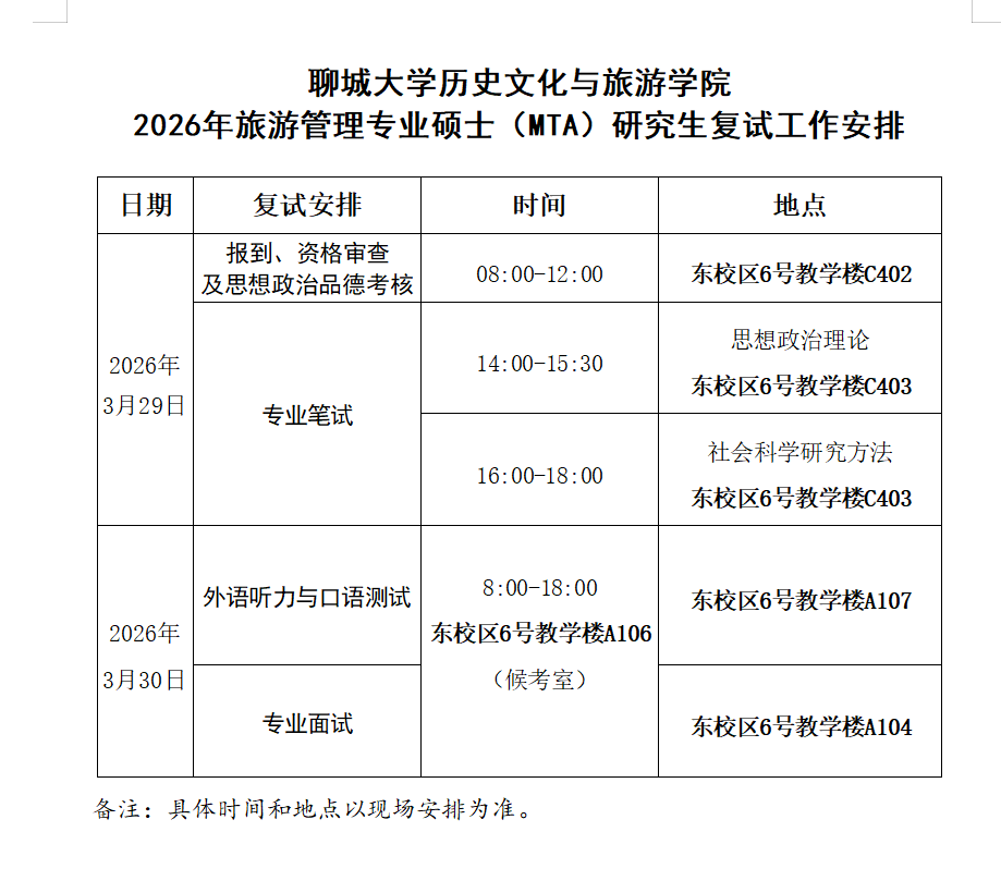 2026年硕士研究生复试录取工作方案》要求提交相关材料,进行复试资格审核。资格审核不合格者,不得参加复试。 二、复试方式及安排 1.一志愿复试。复试采用线下现场复试方式。 旅游管理专业硕士(MTA)于3月29日至30日进行。考生应于3月29日08:00—12:00,携带相关材料到东校区6号教学楼C402教室报到,进行现场复试资格审核。考生可凭准考证自东校区东门进校。3月29日下午14:00,在C403教室进行专业笔试;3月30日8:00—18:00,分别在A104教室和A107教室进行综合面试及外语听力与口语测试。 2.复试咨询服务电话:0635—8239977 三、复试内容及形式 1.专业测试。考试科目按照第一版主