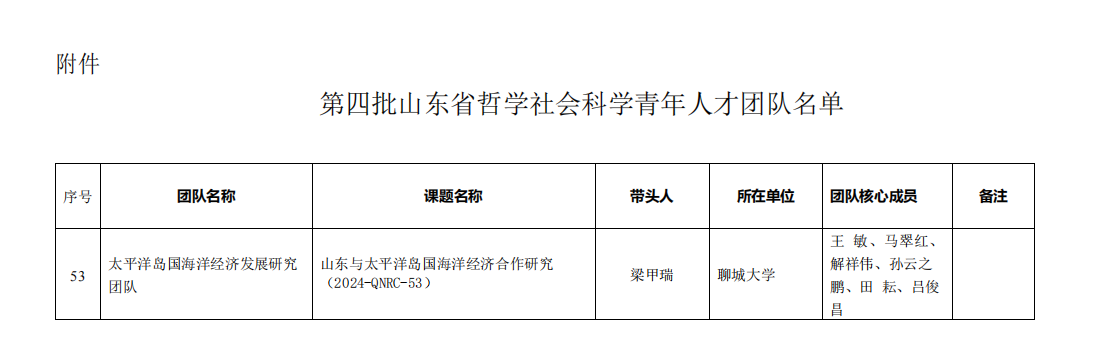 、外国语学院、音乐与舞蹈学院,团队学术带头人为梁甲瑞博士。该研究团队立足在太平洋岛国的实地调研,主要聚焦太平洋岛国海洋经济本体以及山东与太平洋岛国海洋经济合作,旨在为山东加快海洋强省建设建言献策,并深入了解太平洋岛国海洋经济的历史与现实。 山东省哲学社会科学青年人才团队的设立,旨在着眼于培养青年人才的快速成长,打好扎实的学术基础,围绕构建具有中国特色的哲学社会科学学科体系、话语体系与学术体系,发挥团队整体学术优势,深入开展跨学科、跨领域的联合攻关,推出具有理论深度、学术分量和社会影响的创新性成果,在构建中国特色、齐鲁风格、山东气派的哲学社会科学进程中发挥更为重要的作用。 据悉,第四批山东省哲学社会科学青年人才团队经申报推荐、专家评审等环节,共有90支团队获批立项。下一步,学院将持续培养一批具有创新能力和发展潜力的青年学术带头人,搭建交流平台,提供资源支持,产出更多有影响力成果。