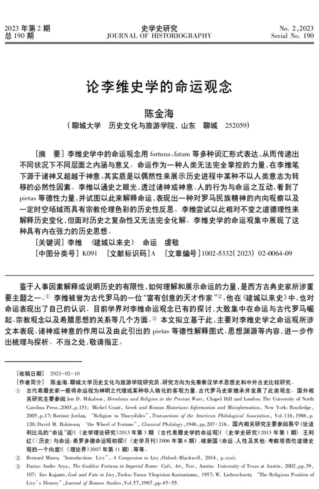 学术简报丨陈金海:论李维史学的命运观念